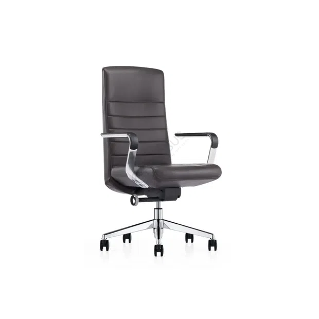Supporting the seat are sleek, polished metal armrests and a sturdy metal base. The contrasting materials create a visually appealing look, typical of modern design aesthetics. The base is equipped with smooth-rolling casters, allowing for easy movement around your workspace. This armchair combines essential ergonomic features with an elegant design, making it a statement piece for any dedicated work area.