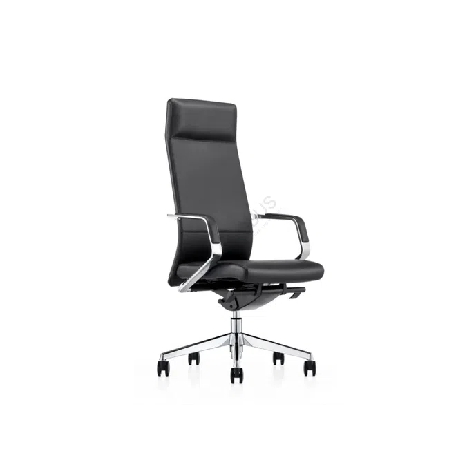 A high-back office armchair offers a commanding presence and sophisticated design. Upholstered in supple black leather, the seat and backrest feature distinctive horizontal ribbing, creating a look of tailored precision and providing supportive structure. The clean lines and sculpted form embody modern elegance.
