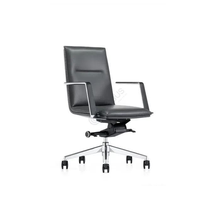 Distinguished by its sleek form, the armchair features polished aluminum armrests that complement the base. The robust aluminum five-star base is fitted with smooth-rolling wheels, allowing for easy movement across the floor. An integrated adjustment mechanism provides control over the chair's height and recline, allowing for personalized comfort.