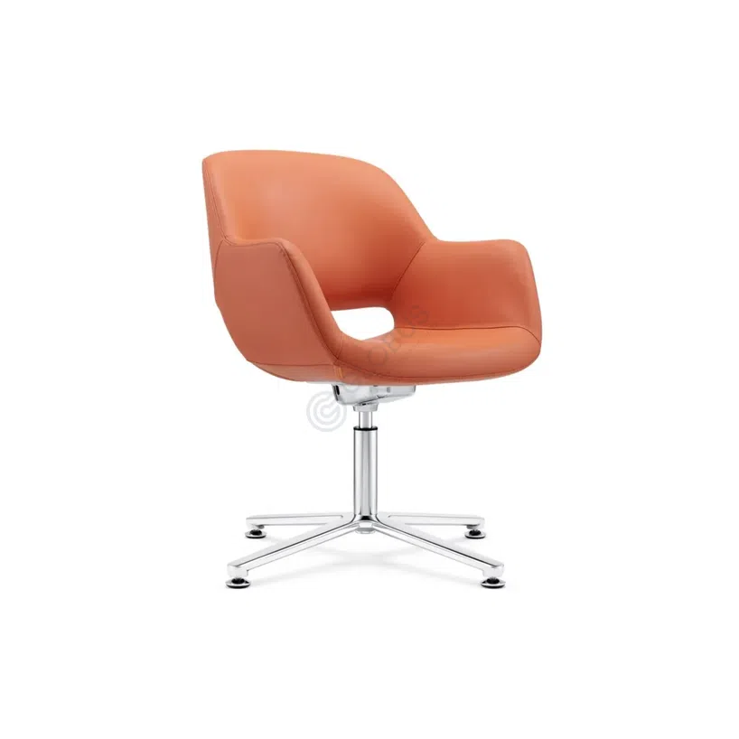 This modern office chair features a gracefully curved seat and backrest upholstered in rich leather. The design offers a comfortable embrace, shaped to support you elegantly throughout the workday. Its inviting color and smooth texture make it a sophisticated addition to any workspace.