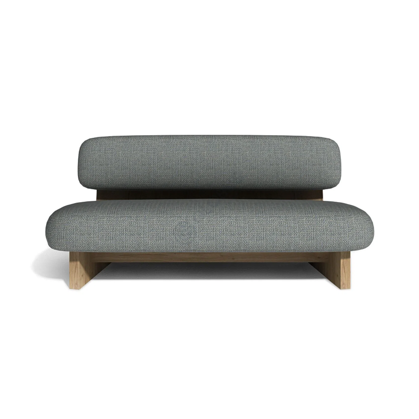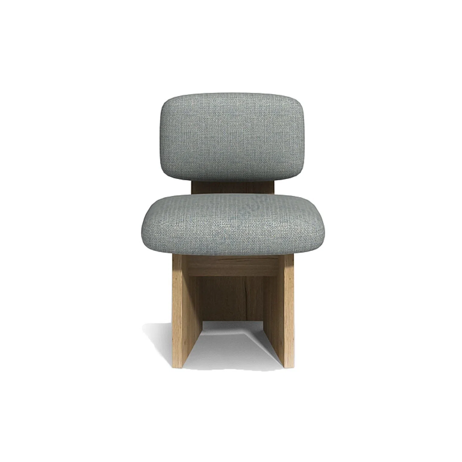 The design highlights the quality of its construction, featuring a solid wood base that provides sturdy support and a warm visual contrast to the upholstery. The natural characteristics of the wood grain enhance the eco-conscious aesthetic.