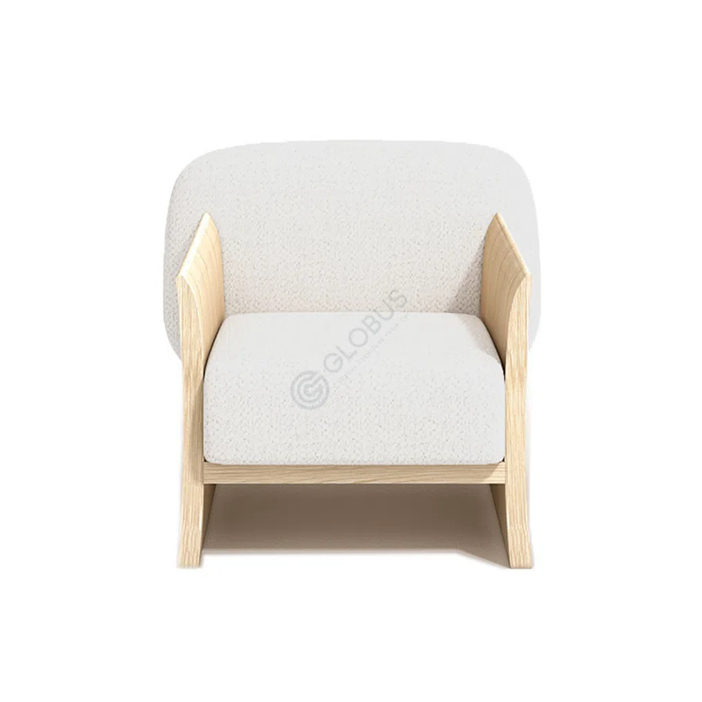 Upholstered in a textured textile, the sofa offers a soft, comforting touch. The light, neutral color of the fabric enhances its contemporary appeal and allows it to seamlessly integrate into various interior palettes. Gently curved arms crafted from the same solid wood extend upwards from the base, adding a distinctive organic detail that complements the overall simple yet refined shape.