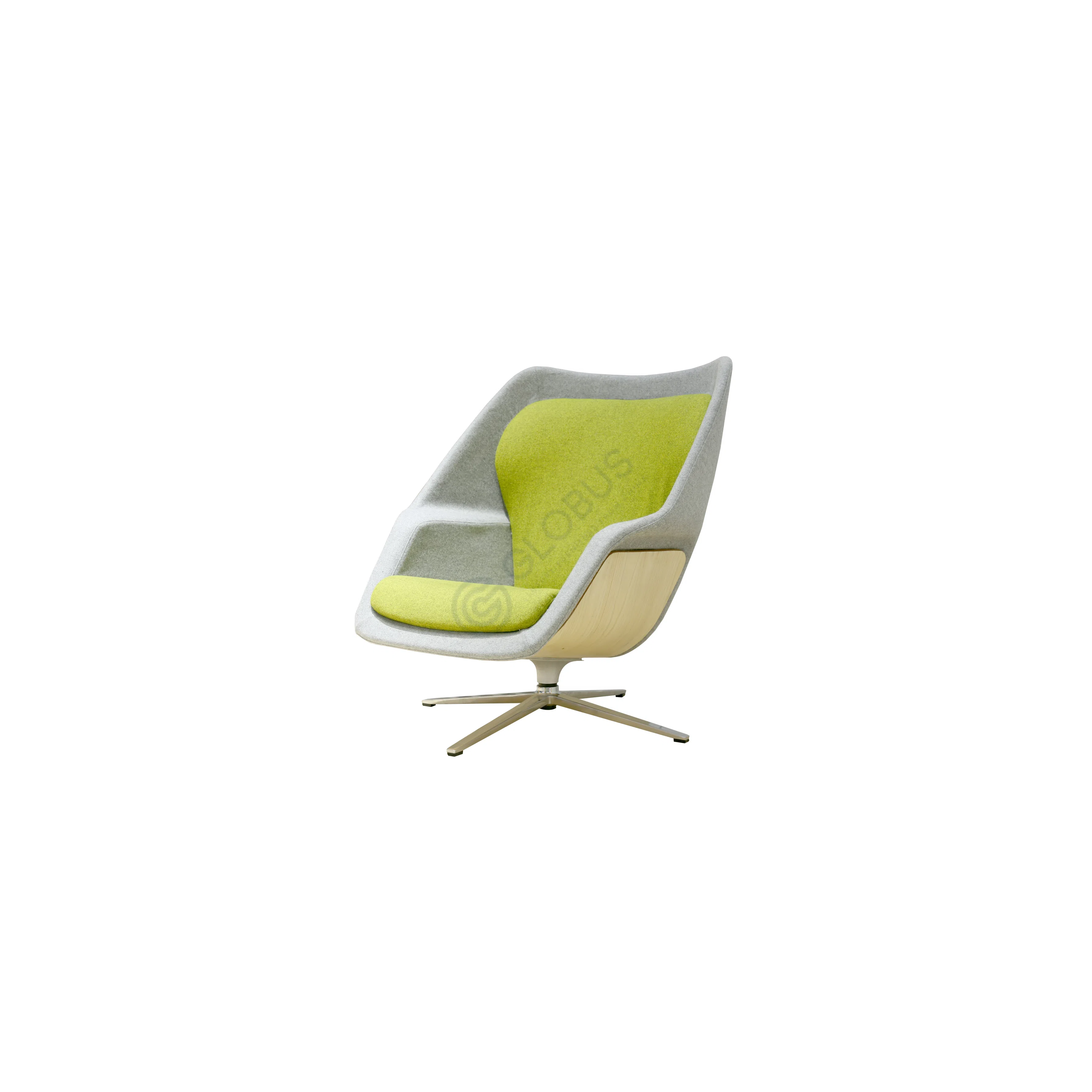 Crafted with a thoughtful combination of materials, the armchair features a textured textile shell enveloping soft, vibrantly colored textile upholstery that provides inviting seating. The base incorporates warm HDF wood accents, seamlessly blending with the sleek, polished aluminum swivel base, which offers smooth rotation and stability.