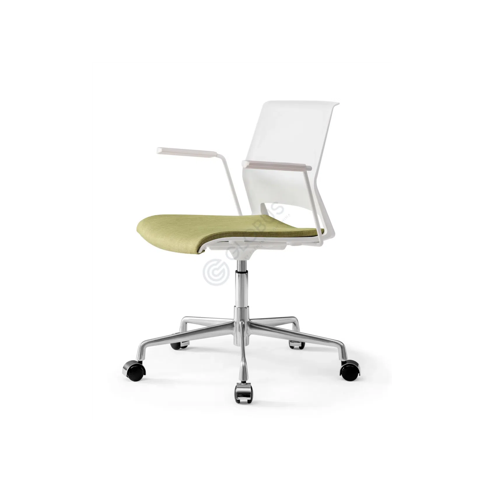 A modern office chair designed with functionality and contemporary style in mind, perfect for enhancing a home workspace. It features a clean white structure supporting a translucent backrest and a comfortable, upholstered seat cushion in a soft green tone. The overall design presents a fresh and adaptable look.