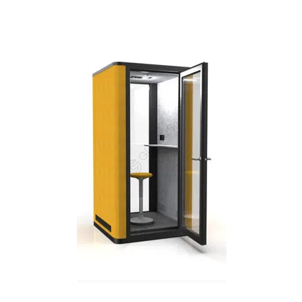 This modern soundproof booth offers a dedicated space for focused work or private calls. Its design blends contemporary aesthetics with functional engineering, providing a quiet retreat within a busy environment.