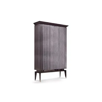 The design showcases quality materials, combining the warmth and structure of solid wood, natural veneer, and plywood for its core components. The base culminates in a striking square foot, subtly accented with polished stainless steel trim, adding a refined gleam. The rich, dark finish on the wood elements enhances the table's luxurious presence, making it a compelling accent piece.