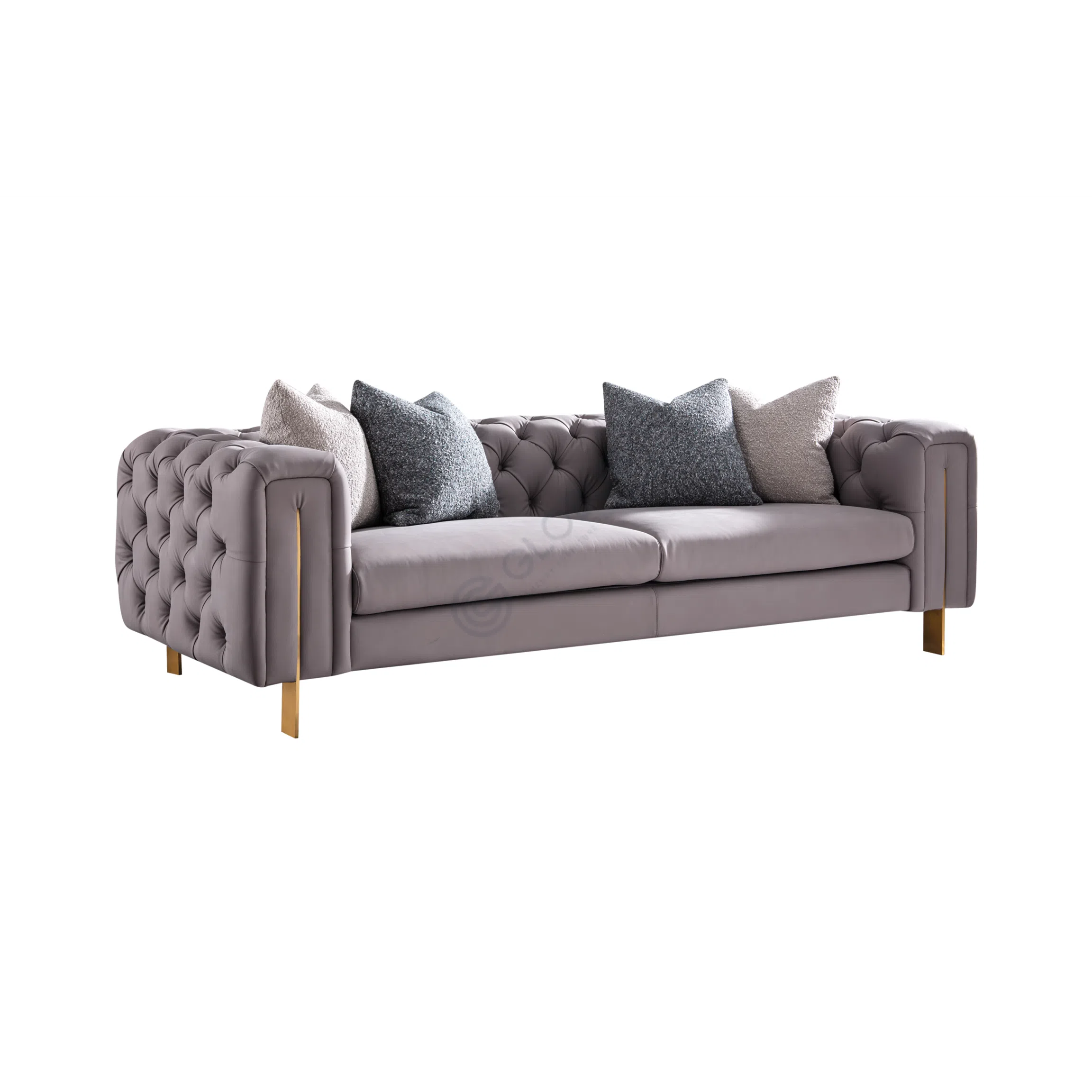 The armchair is crafted with a solid wood framework, ensuring durability and sturdiness for lasting comfort. Sleek metal accents, in a sophisticated gold finish, beautifully complement the soft gray fabric, adding a touch of glamour and modernity to its classic design.