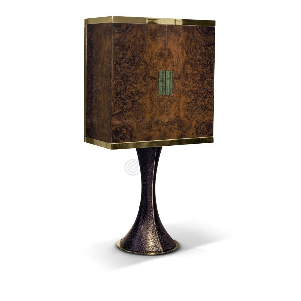 A sculptural sideboard with a long, refined silhouette, it pairs a richly figured natural veneer with the crisp geometry of Art Deco. The cabinet is elevated on two trumpet-shaped legs wrapped in suede leather, finished with stainless steel bases that add a subtle gleam. A dark glass top gives a smooth, practical surface while accenting the clean, modern lines.