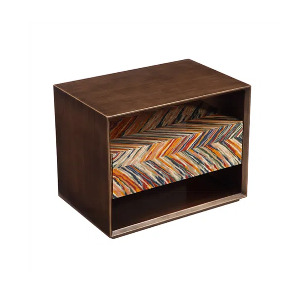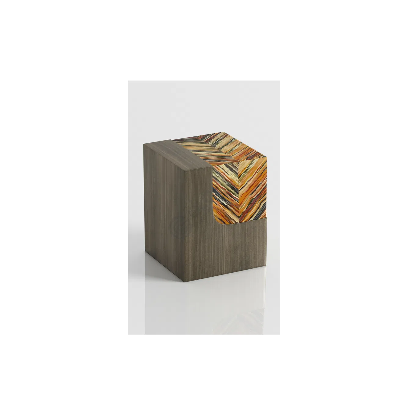 This distinctive cabinet is a sculptural statement piece designed to capture attention. Its upper section features a unique, softly rounded silhouette adorned with a vibrant natural veneer applied in a striking chevron pattern, showcasing a rich interplay of colors and textures.