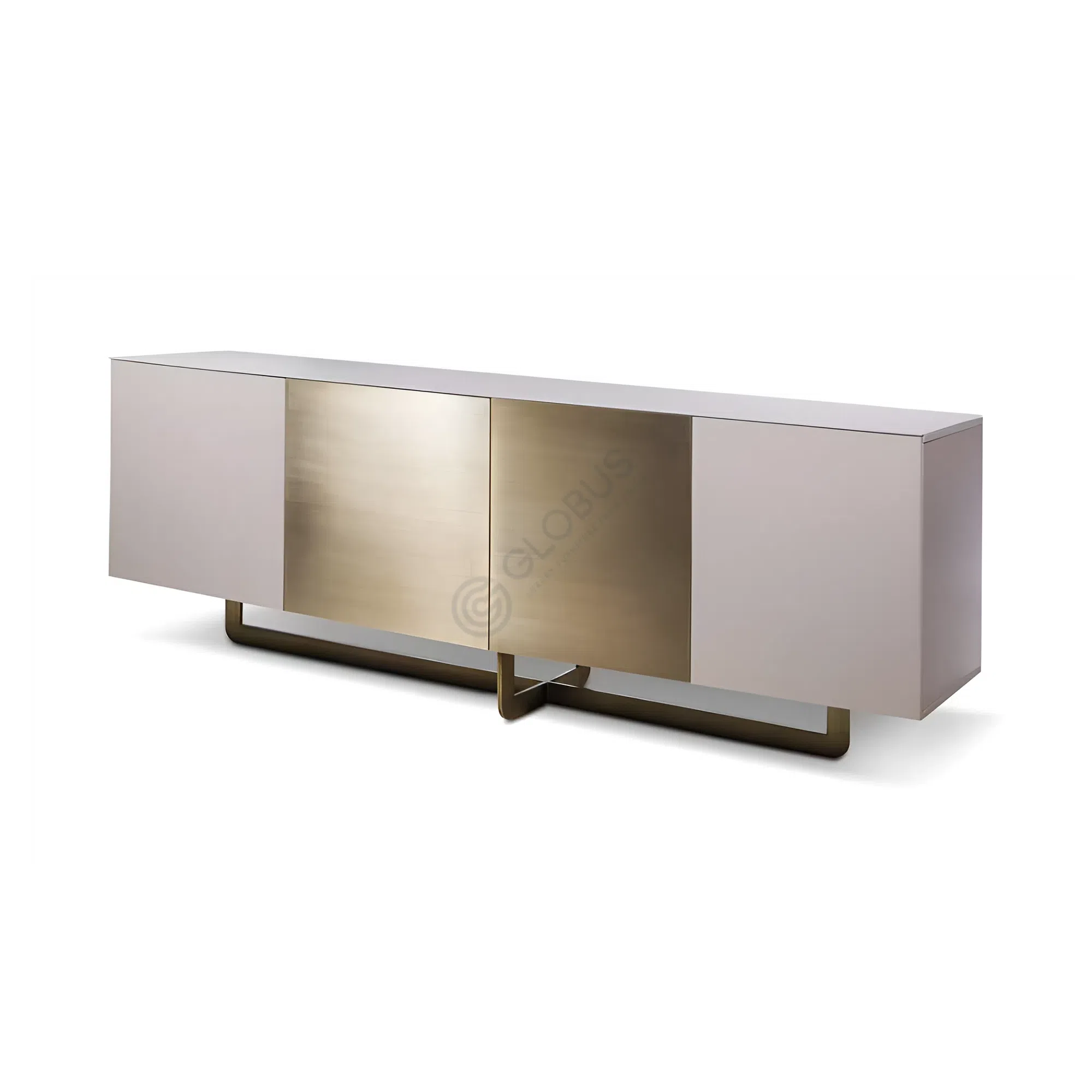 The design skillfully combines a durable plywood structure with exquisite finishes. A smooth glass top provides a sleek surface, complementing the contrasting facade panels. The central panel gleams with a rich bronze finish, harmonizing with the lighter, matte tones of the outer sections.