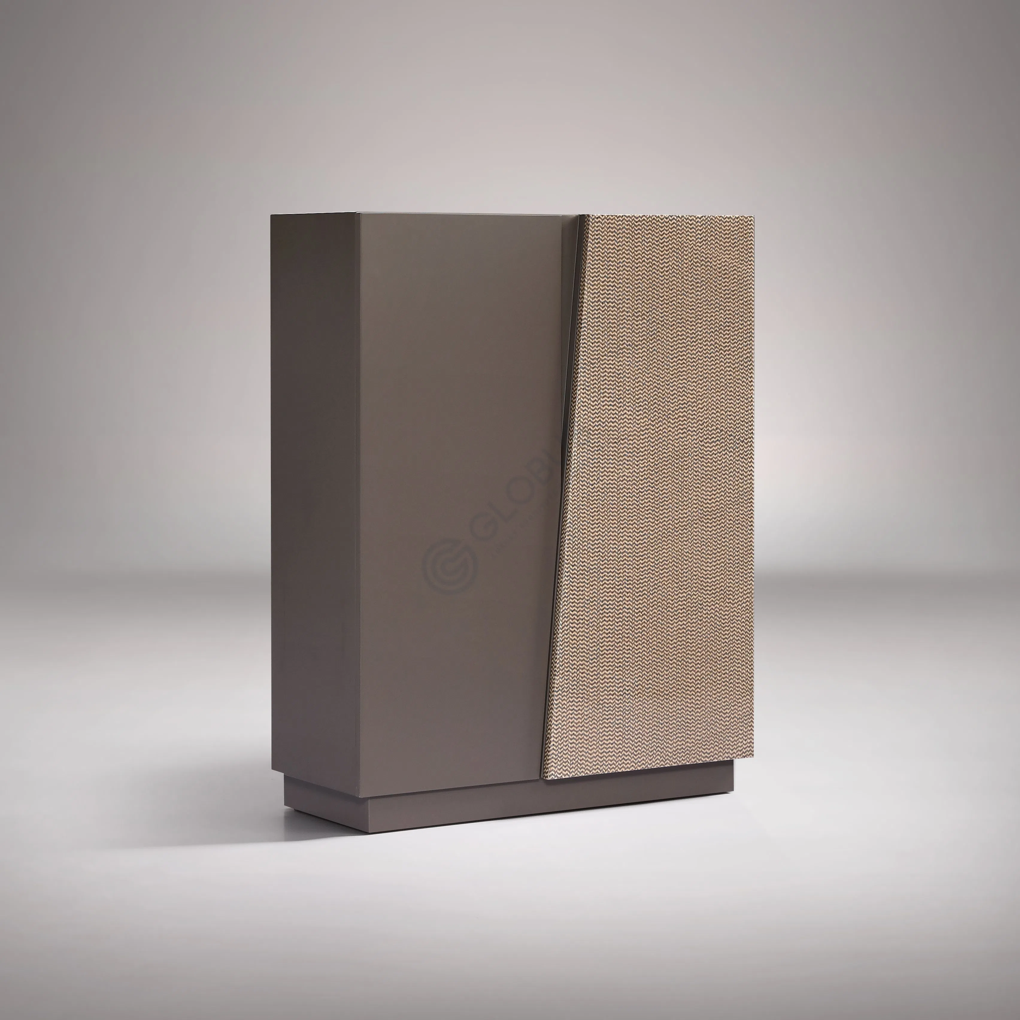 This bedside table presents a captivating design with a unique natural veneer pattern wrapping its elegant form. Crafted from solid wood, the piece showcases the rich, inherent beauty of its materials, creating a visually dynamic surface that draws the eye.