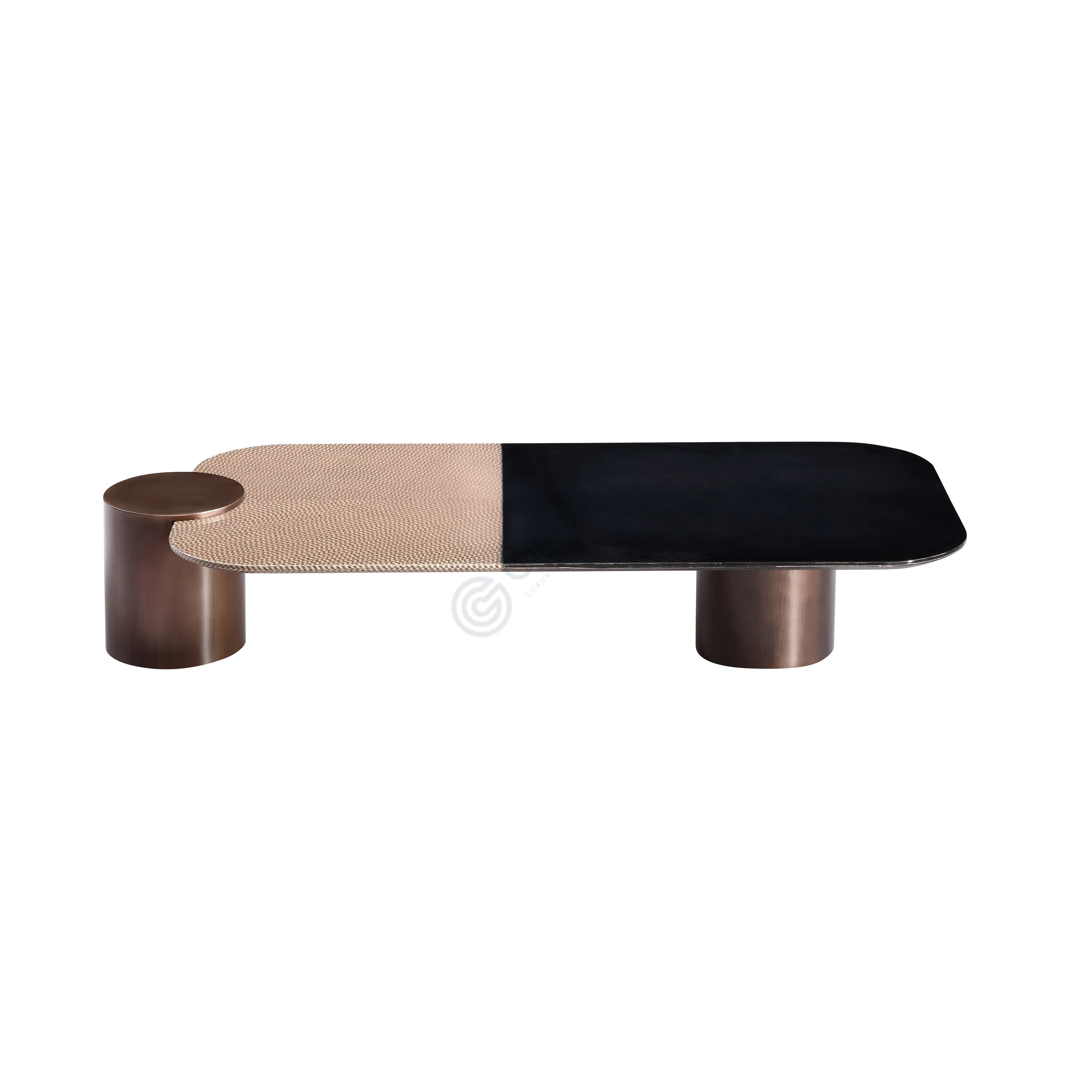Combining the clean lines of modern design with the decorative flair of Art Deco, this table is a statement piece. Its structure features a single, flowing panel balanced by subtle, refined legs, offering both stability and visual lightness. A discreet drawer provides convenient storage.