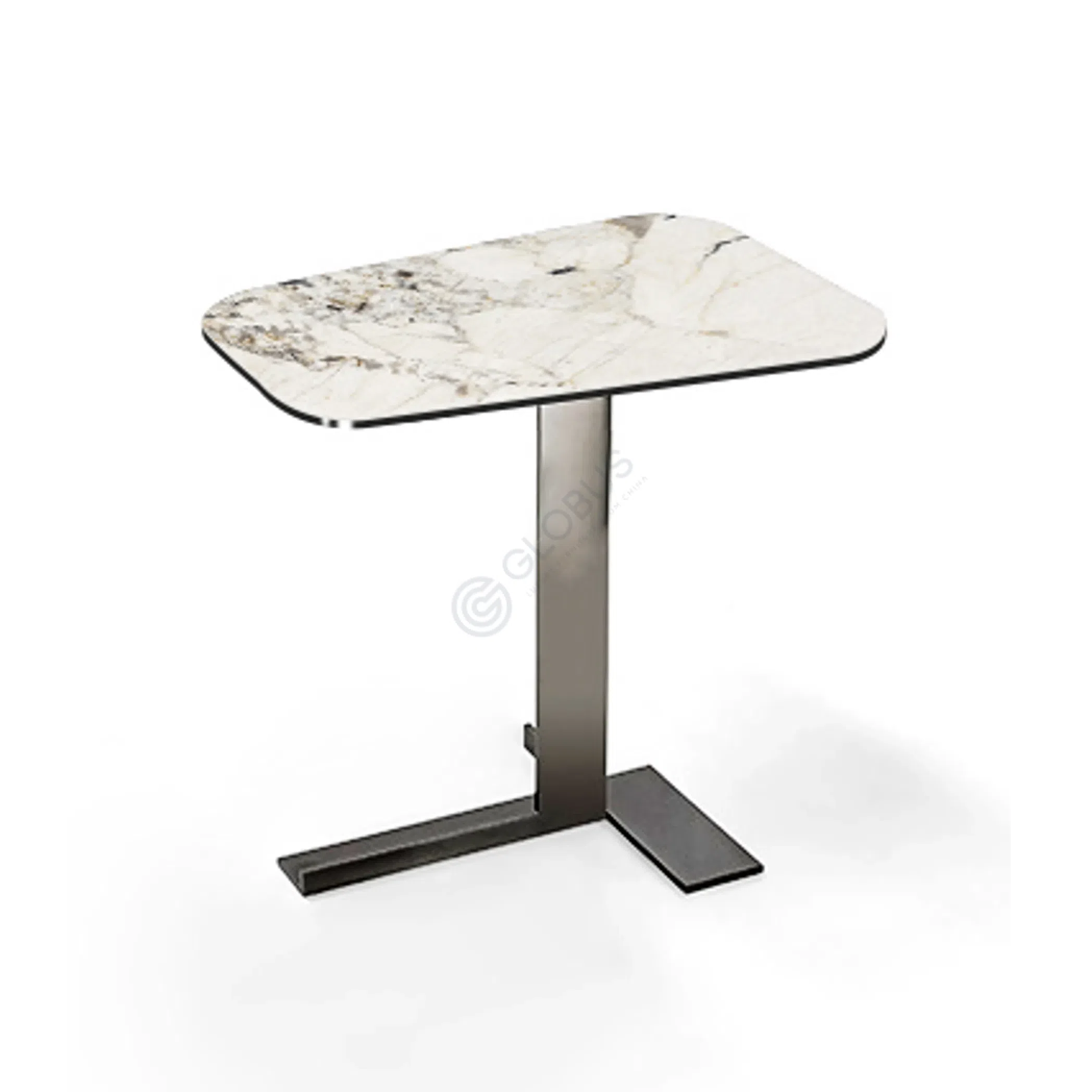 This modern coffee table presents a refined aesthetic, gracefully combining the timeless beauty of natural marble with the strength of titanium. Its elegant, elongated tabletop features softly rounded edges, offering a sophisticated silhouette that enhances any contemporary living space.