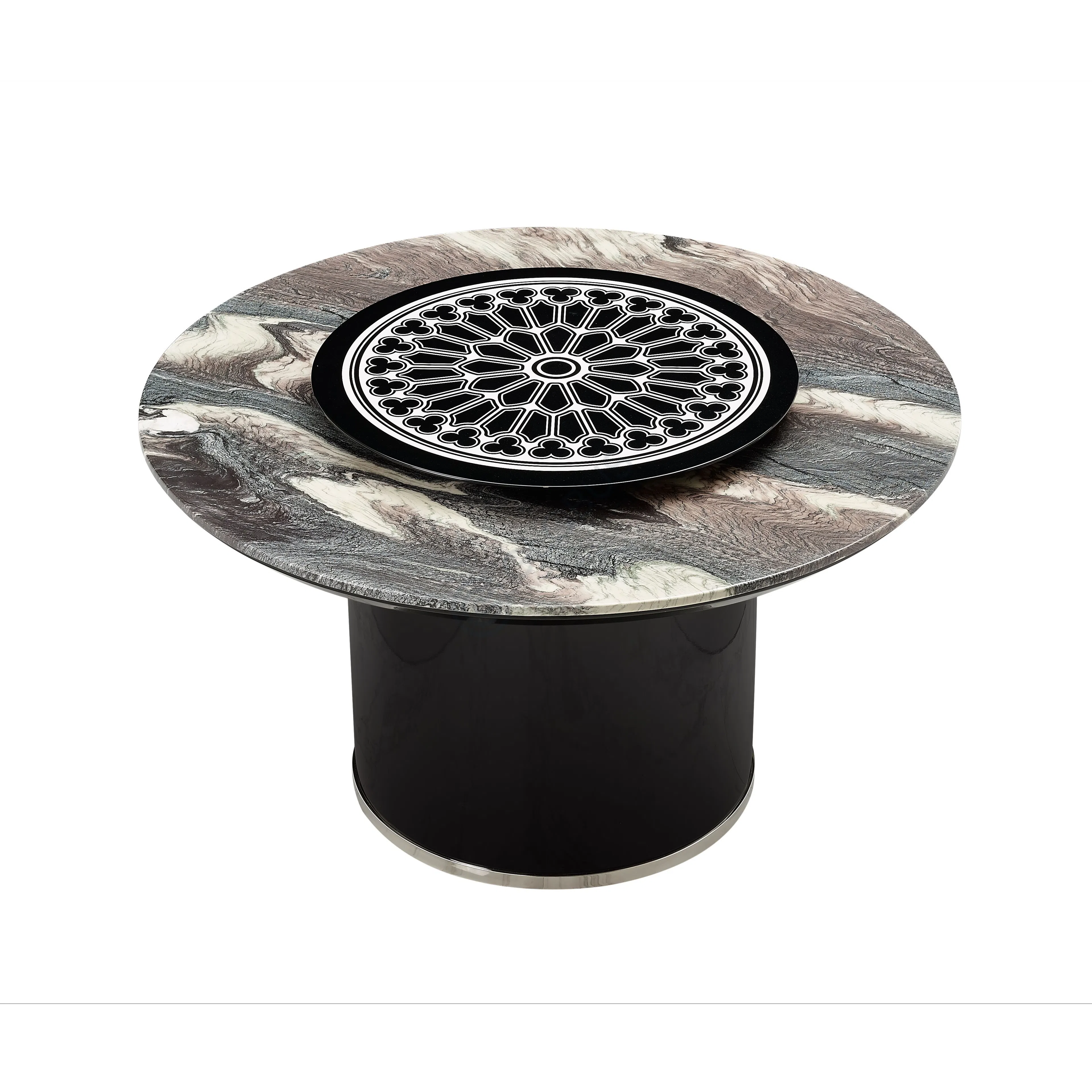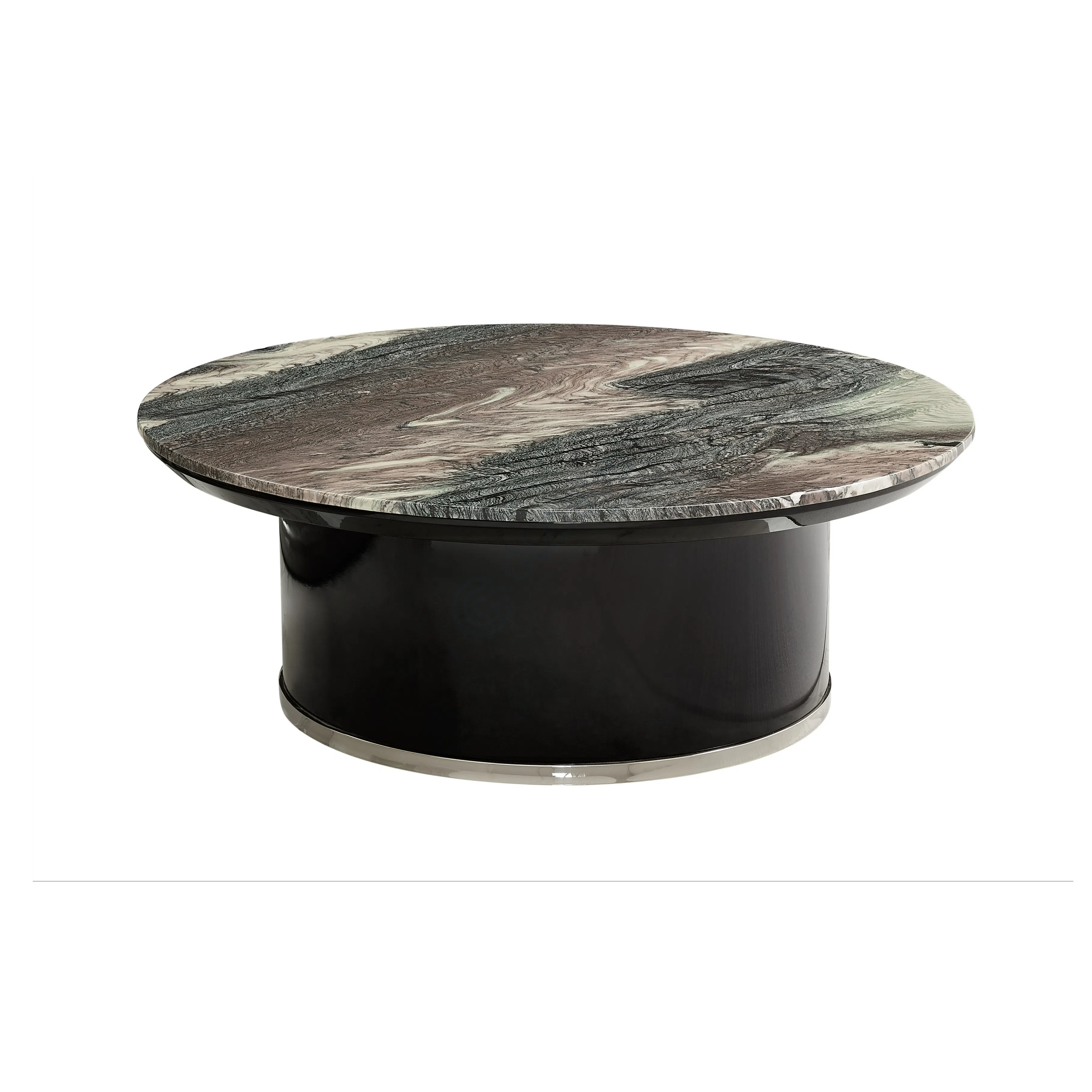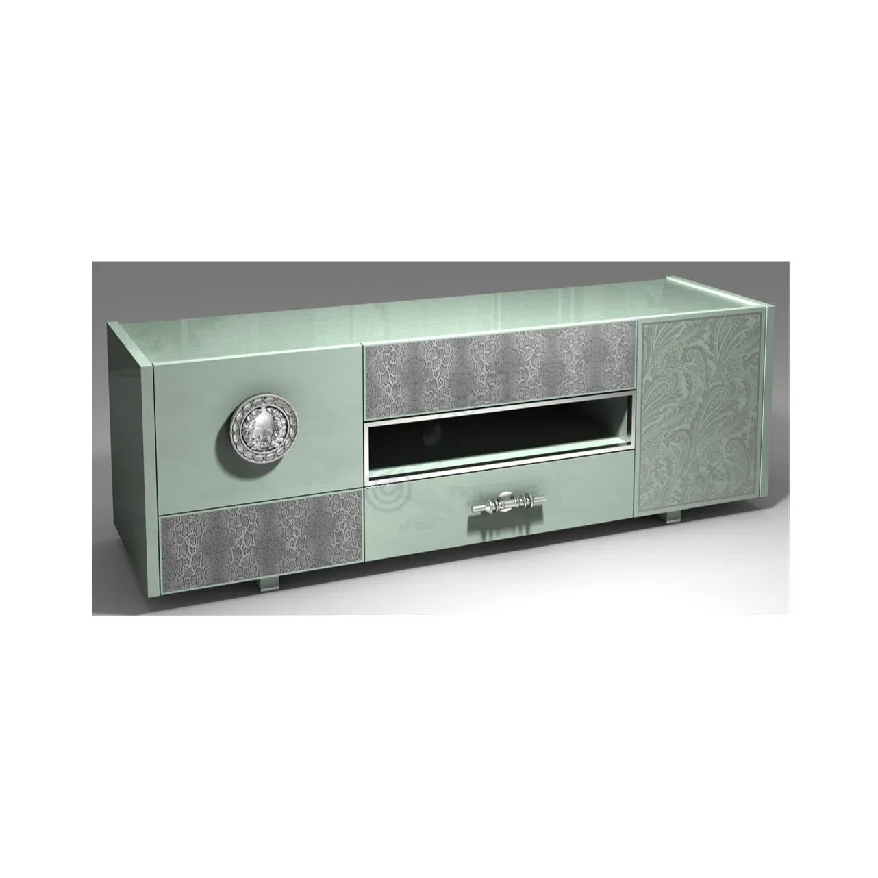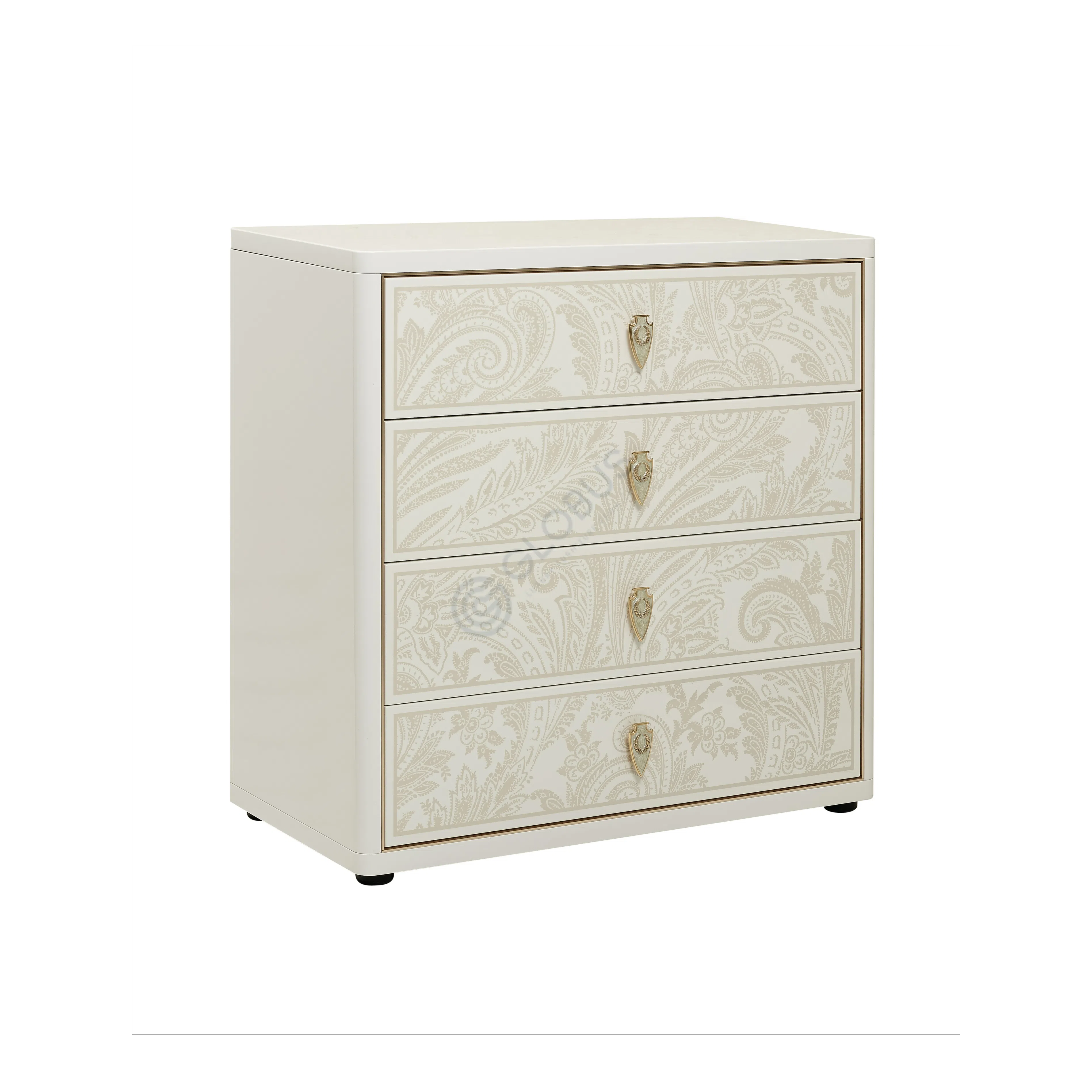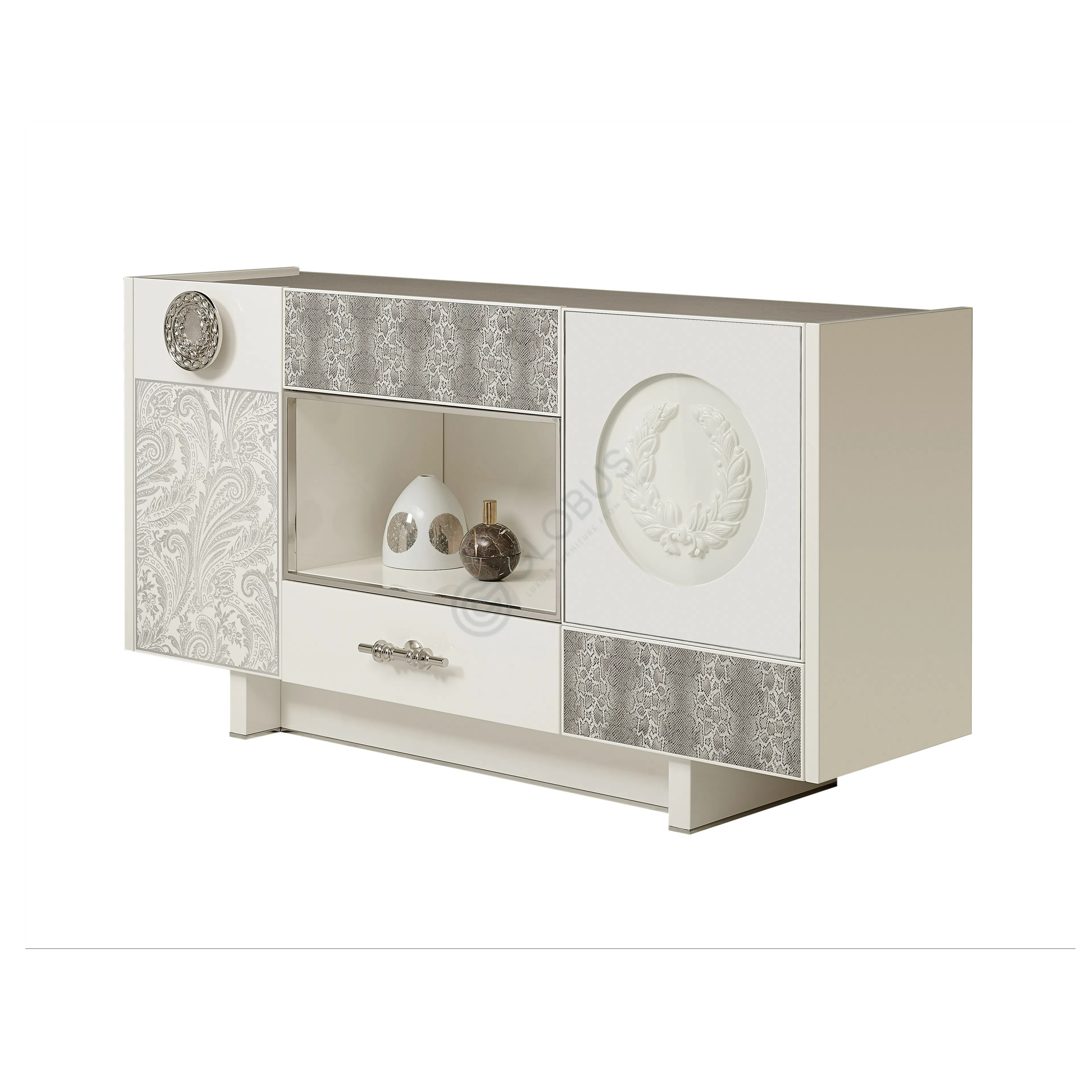 Functionality is provided by a set of three drawers integrated into a cabinet on the opposite side. These drawers feature fronts with a subtle texture or pattern and are fitted with distinctive, ornate metal pulls. The use of premium materials like natural marble and metal detailing, combined with quality wood construction, ensures both beauty and durability. Leather is also incorporated, likely for internal lining or specific accents enhancing the premium feel.