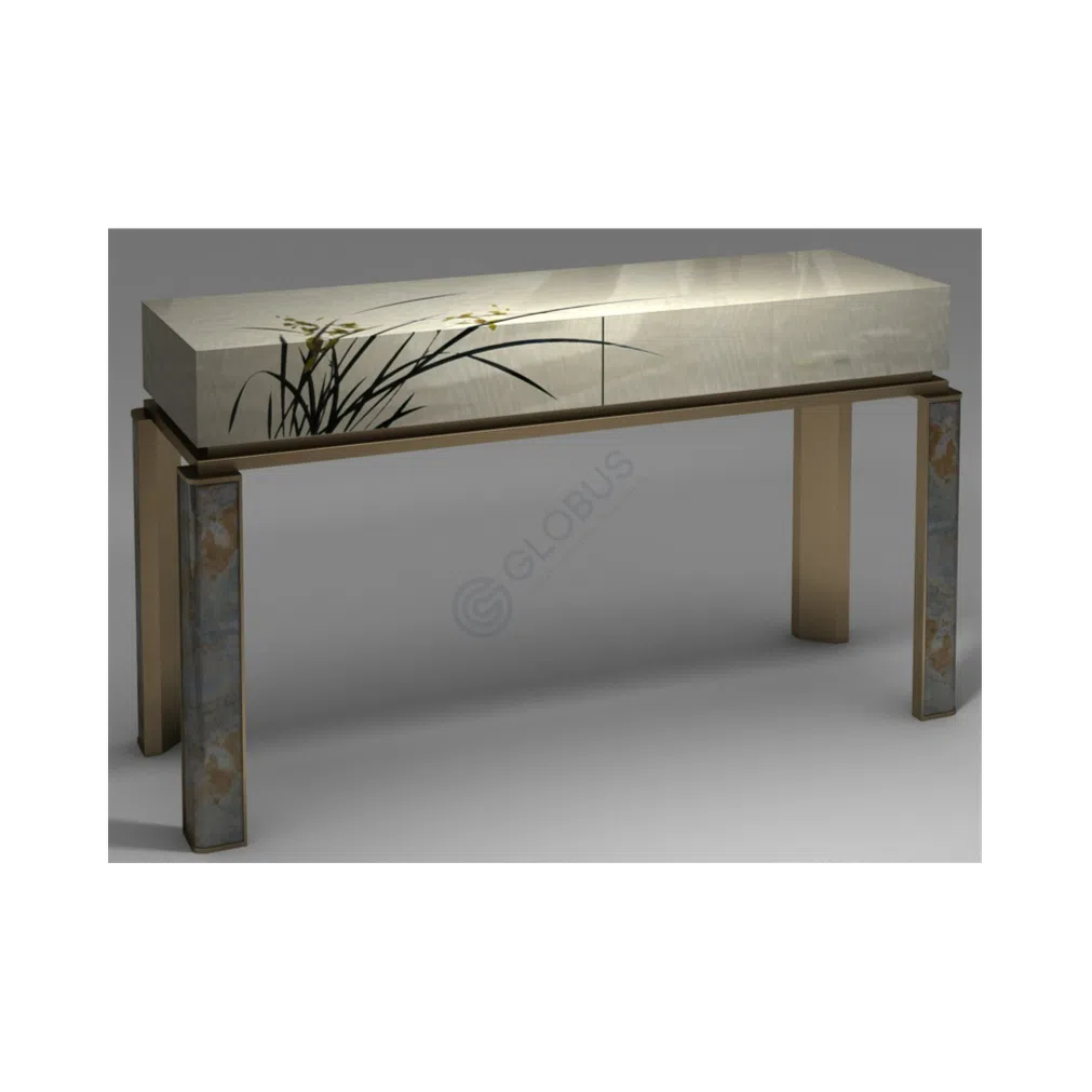 The exterior features a beautiful natural veneer finish adorned with a delicate artistic motif on one door, adding a touch of serene artistry. A unique, sculptural metal handle provides a distinctive focal point. The cabinet stands upon a striking metal base, designed for stability and visual interest.