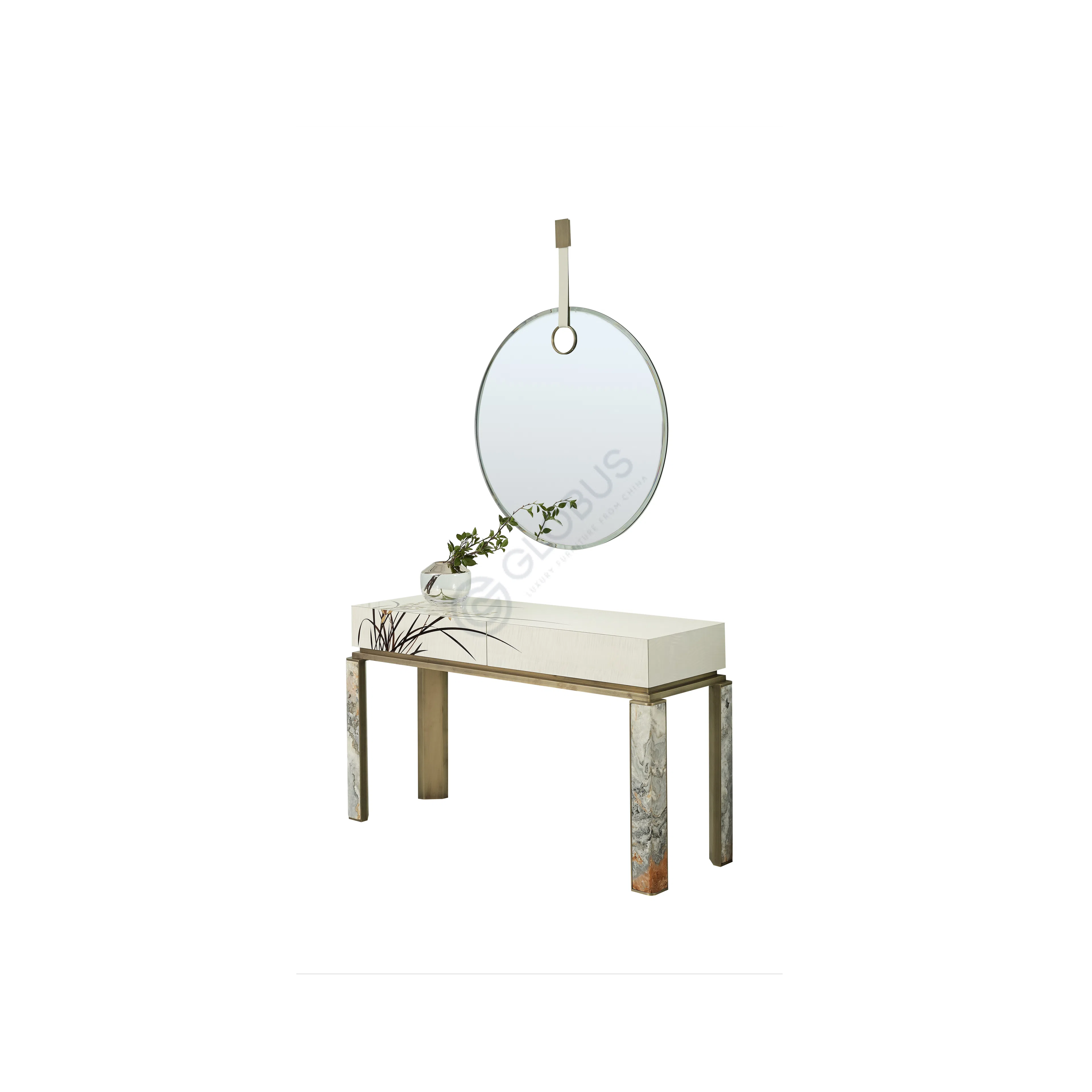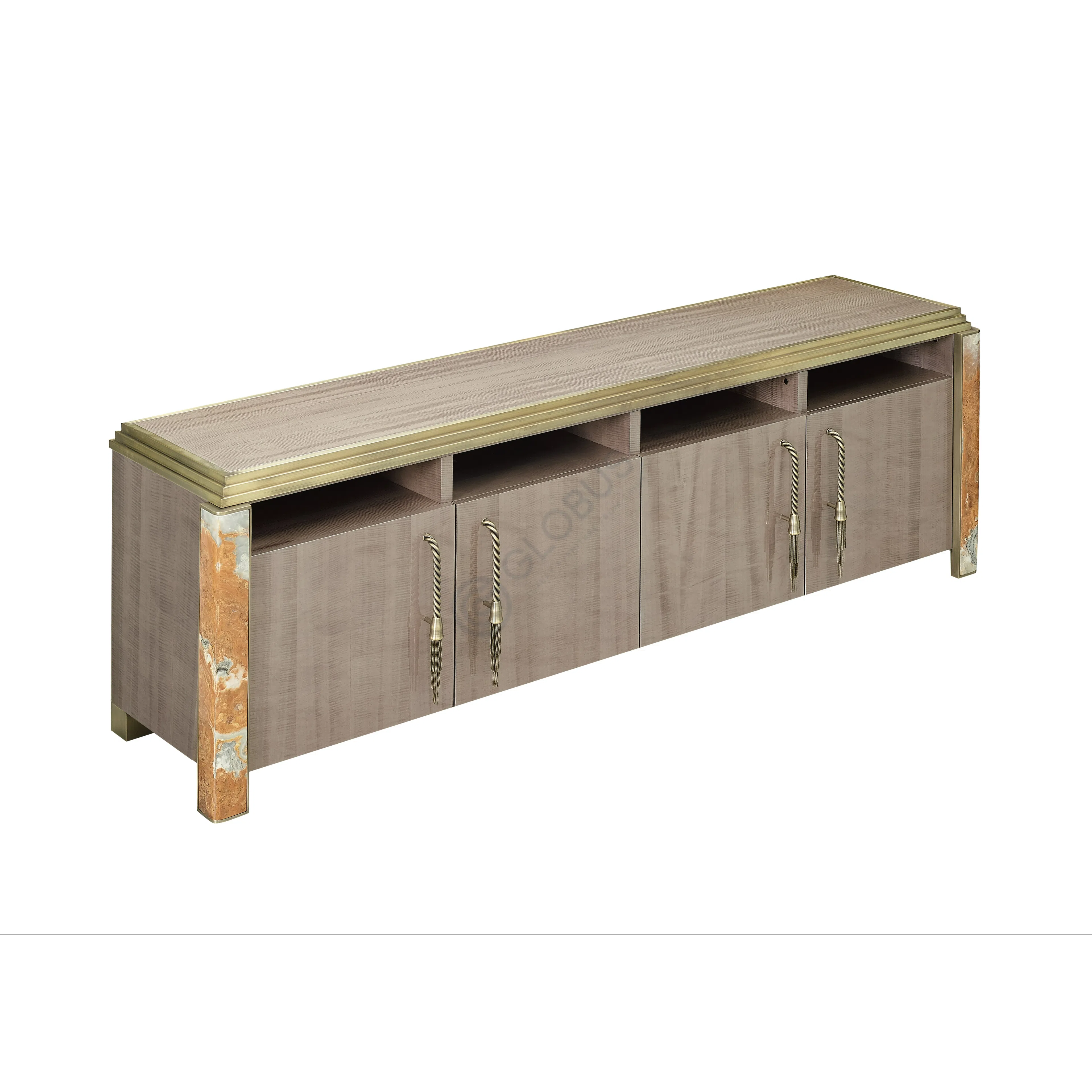 Crafted with care from a combination of natural veneer, solid wood, and durable plywood, this piece utilizes premium materials throughout. Inside, the cabinet incorporates elements of natural marble and tempered glass surfaces, alongside soft leather linings, providing luxurious and protective storage for jewelry.