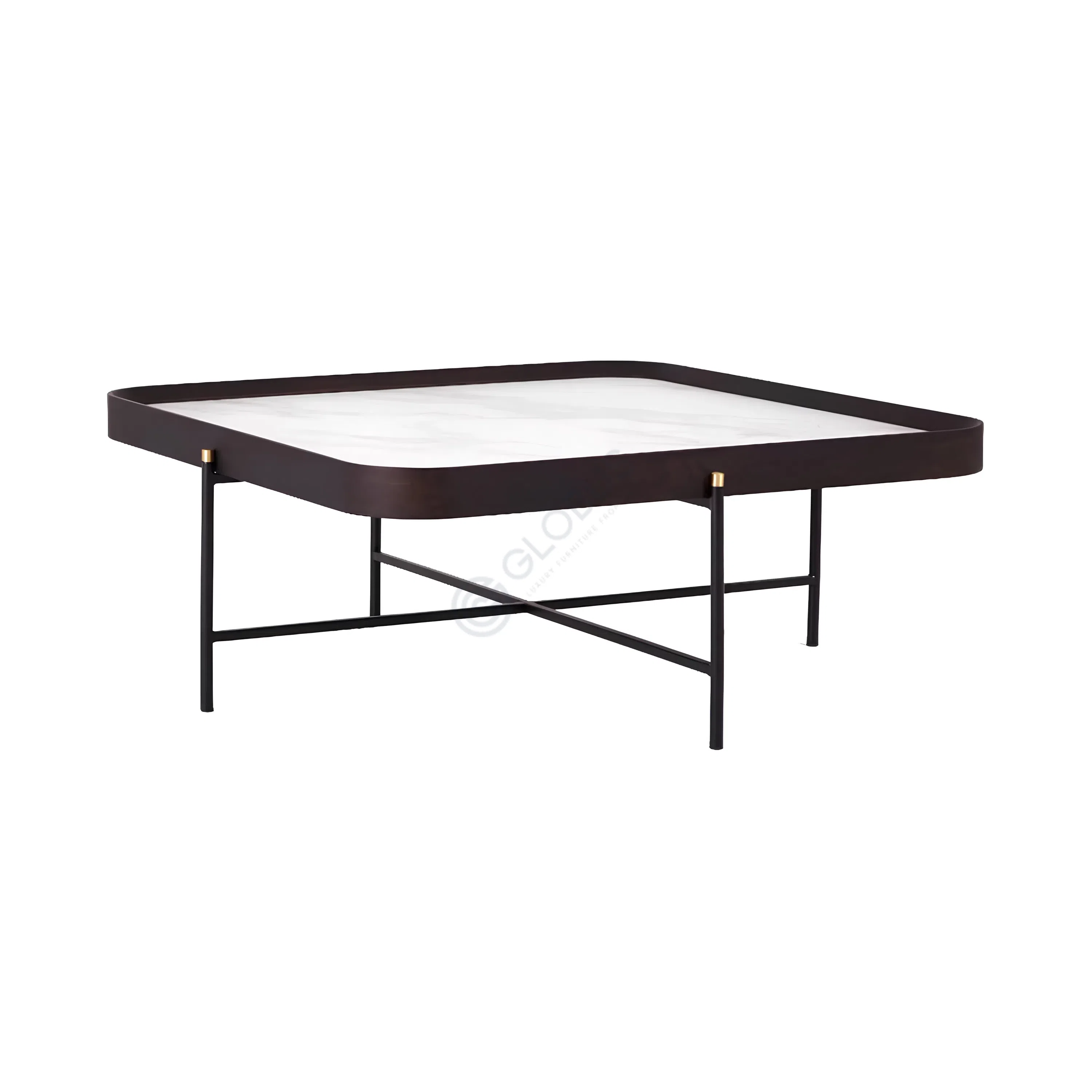 The table stands on a minimalist framework of slender titanium legs, finished in a sleek black. Each leg is precisely joined to the tabletop with a subtle, yet striking brass accent, adding a touch of understated luxury. The legs converge at the base with a thoughtful X-shaped crossbar, providing both stability and an appealing geometric detail.