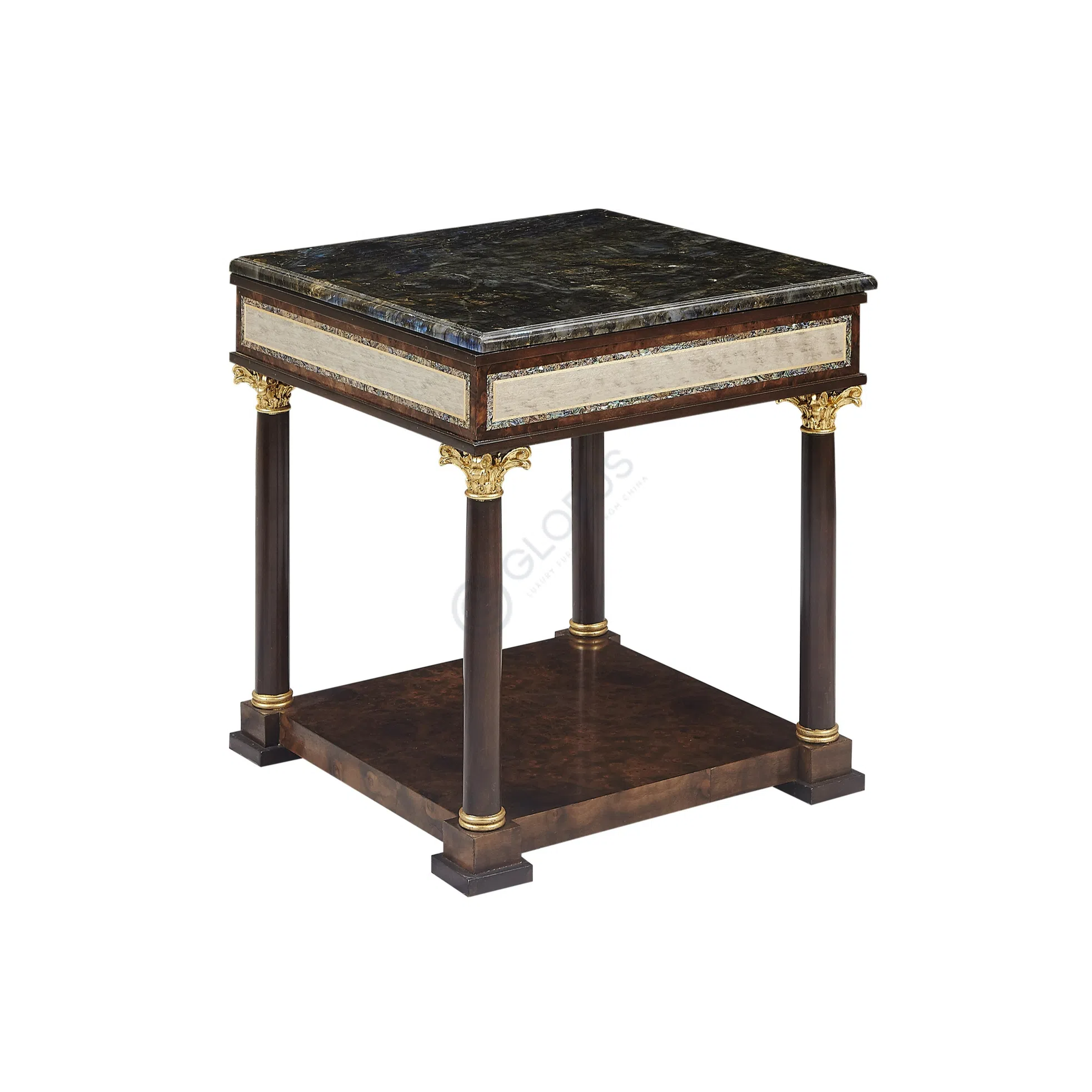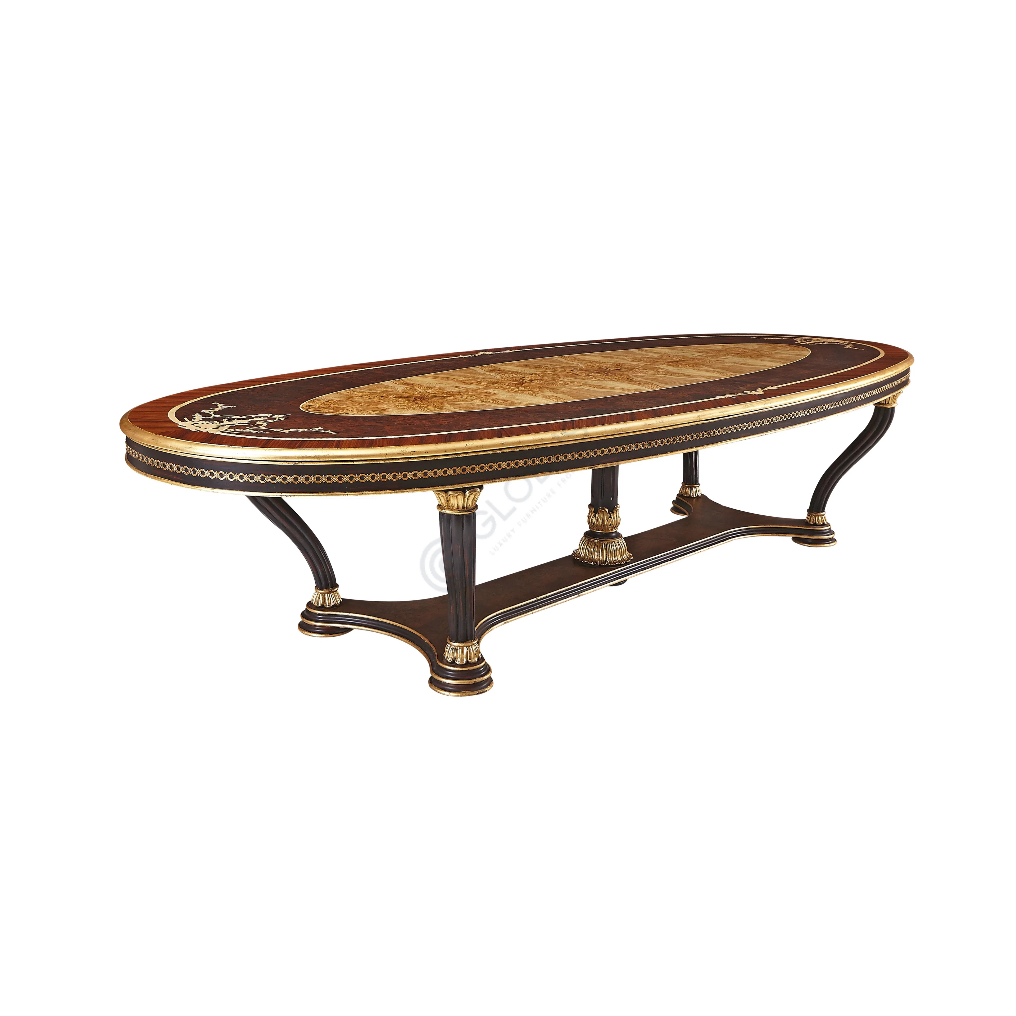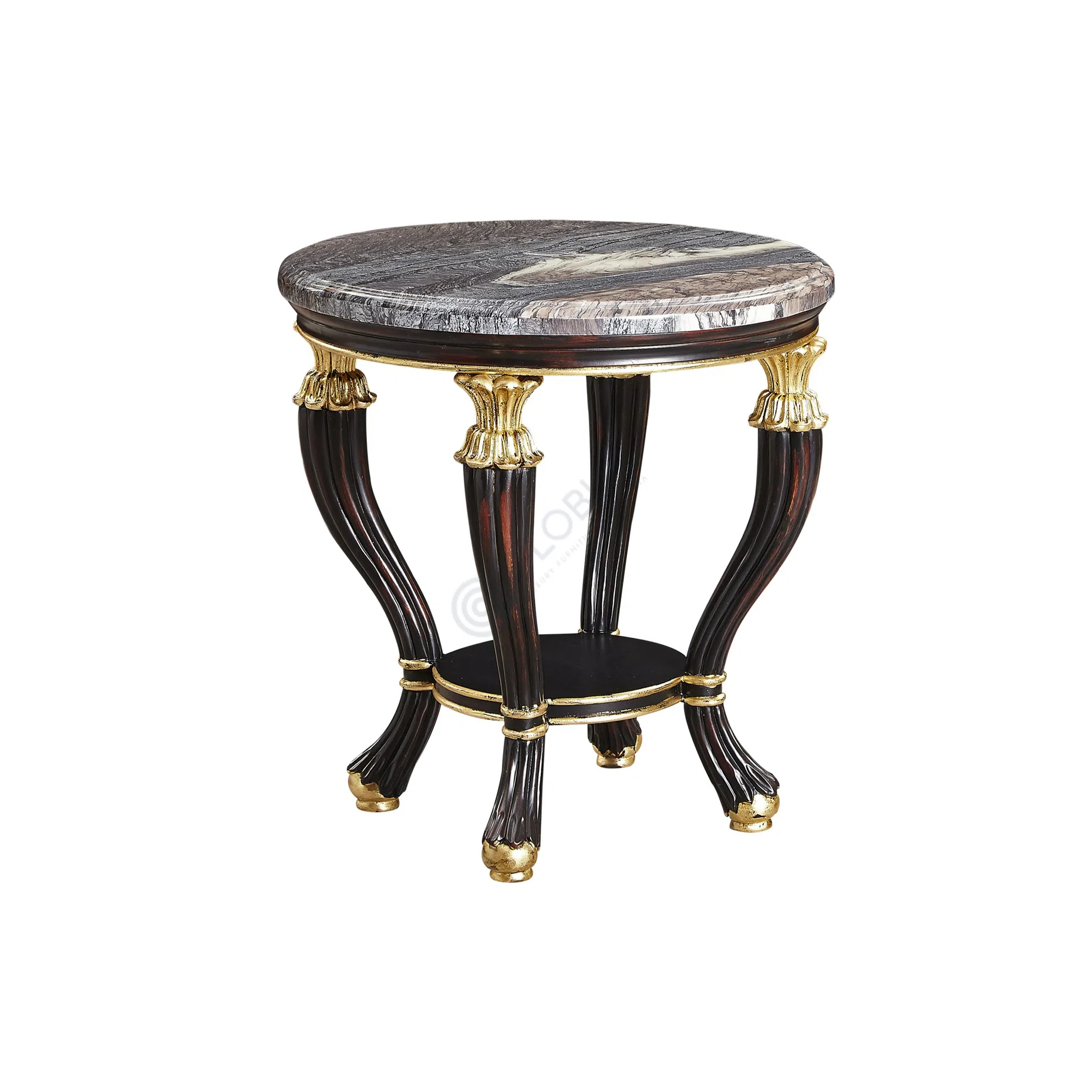 Crafted with a solid wood frame and plywood elements, this chair showcases detailed design. The rich finish is enhanced by a patina effect, highlighting the intricate carved accents found along the legs and backrest, adding depth and character.
