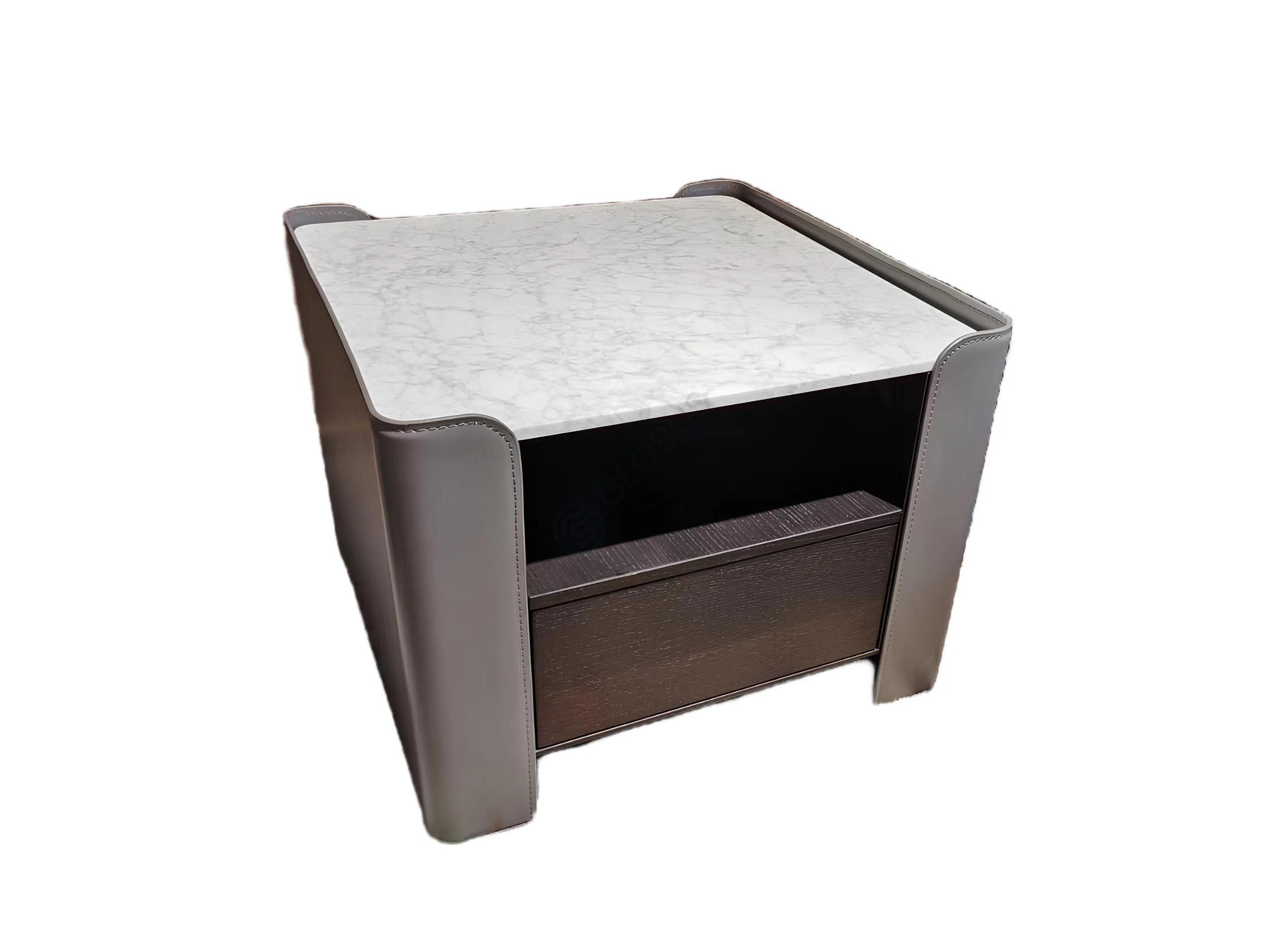 The tabletop is crafted from exquisite natural marble, showcasing unique veining that adds organic artistry to its surface. Below, the main structure, formed from sturdy plywood, is beautifully enveloped in rich saddle leather. This dark leather provides a sophisticated texture and is finished with subtle stitching details that enhance its premium appeal and smooth, rounded edges.