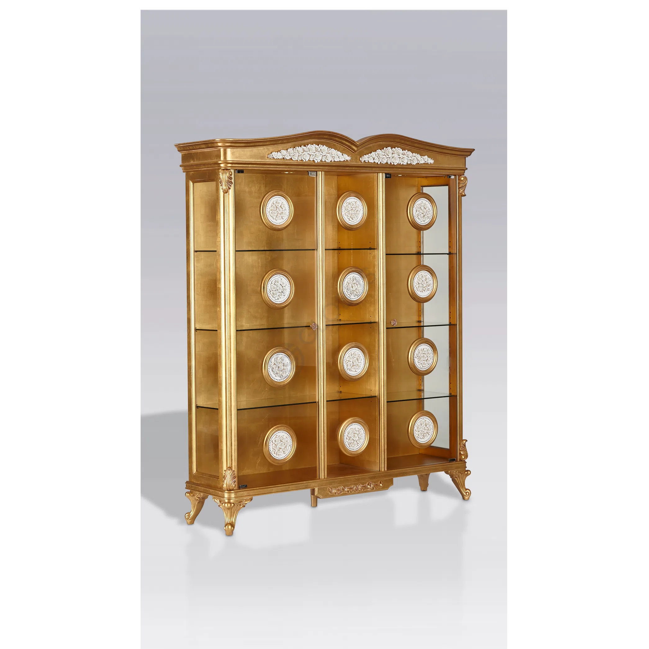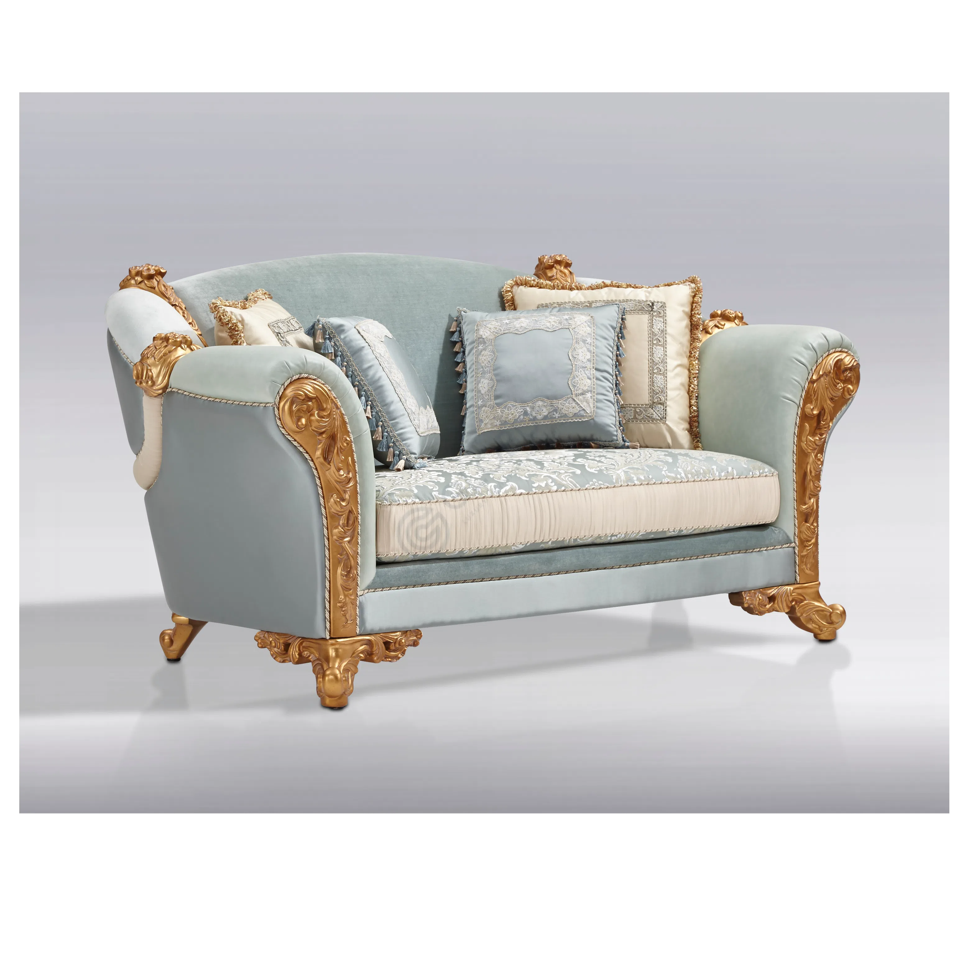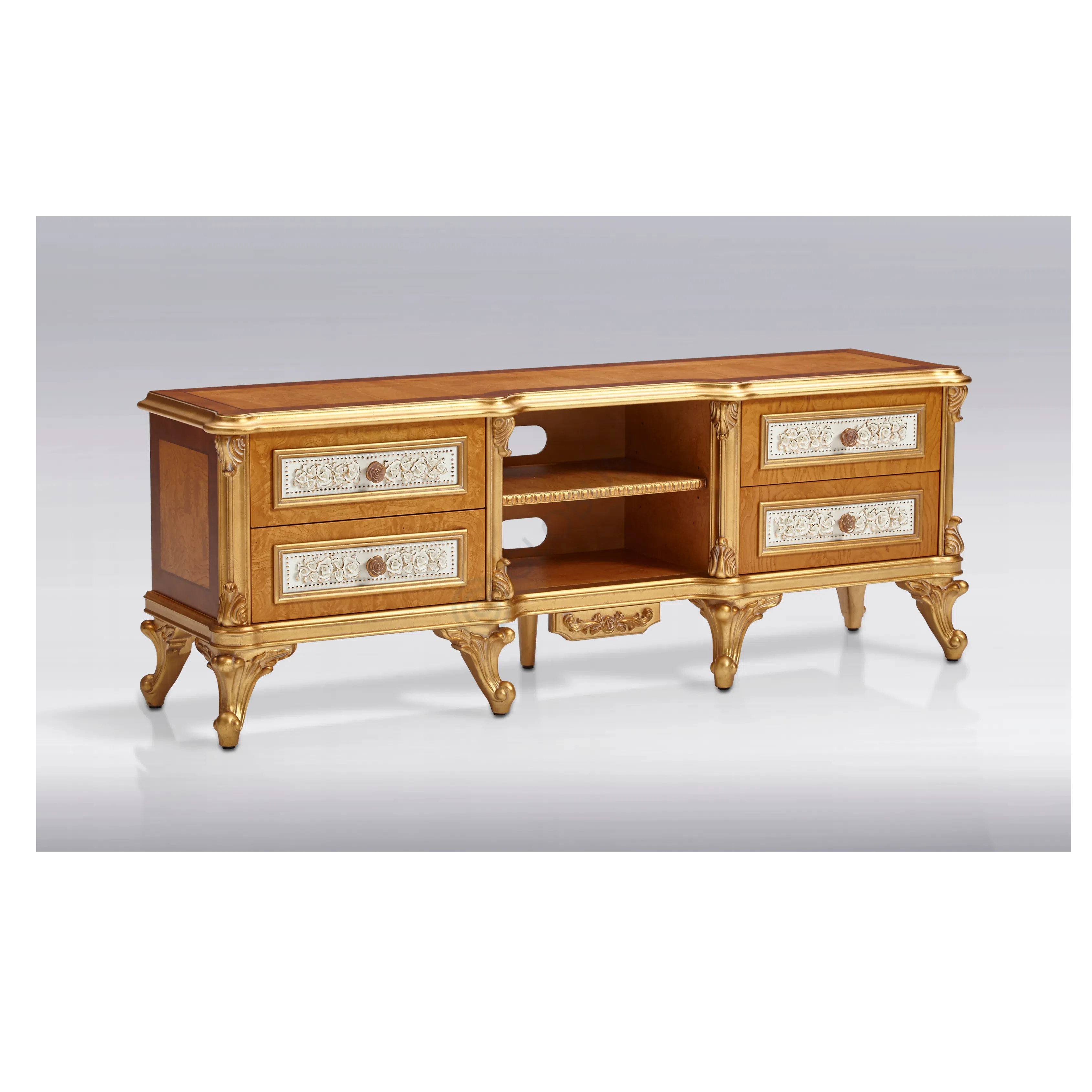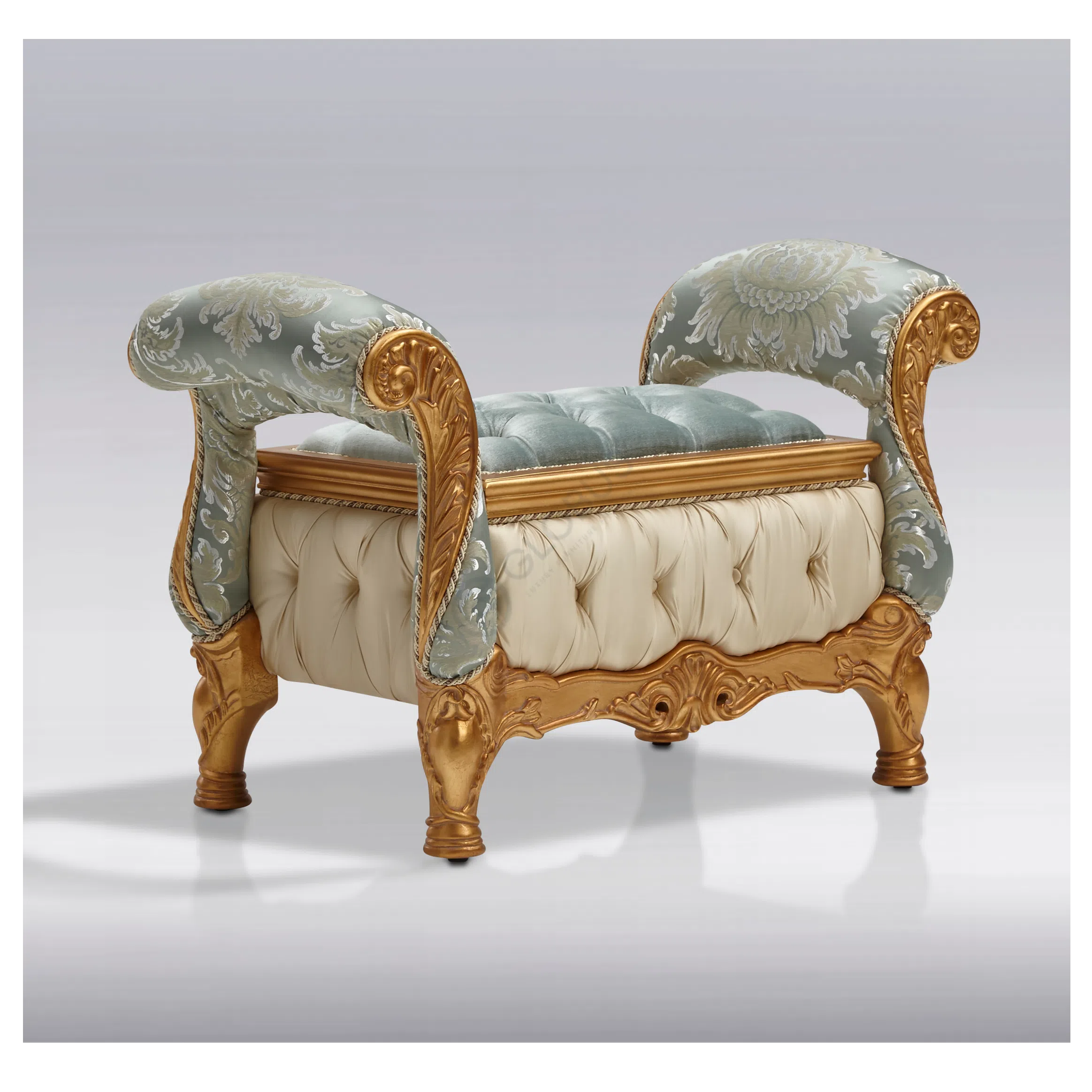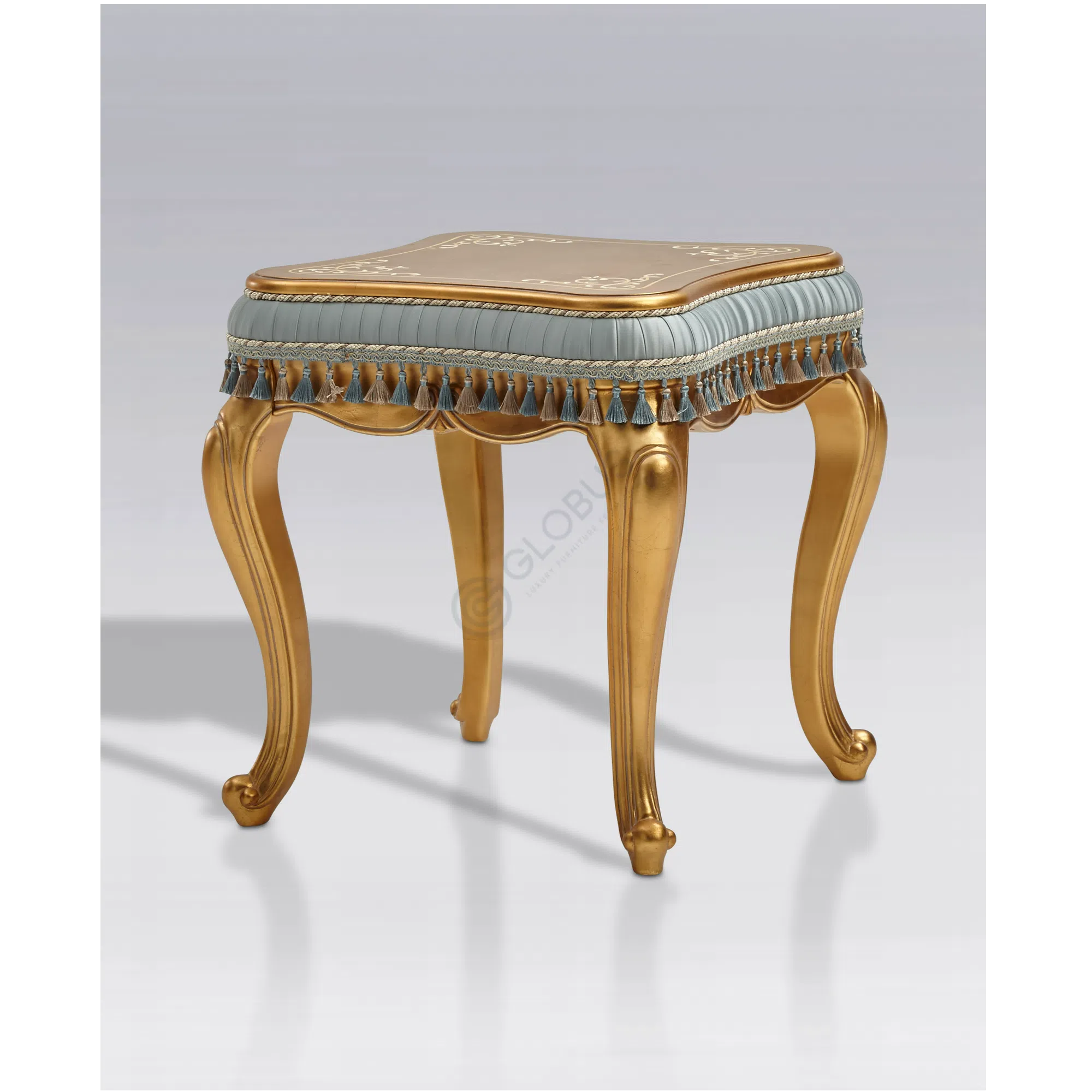 Constructed using solid wood, natural veneer, textile, and plywood, and finished with a detailed patina, this coffee table exemplifies the European classic style. It is a piece built with care, intended to be both functional and a focal point in a luxurious living space.