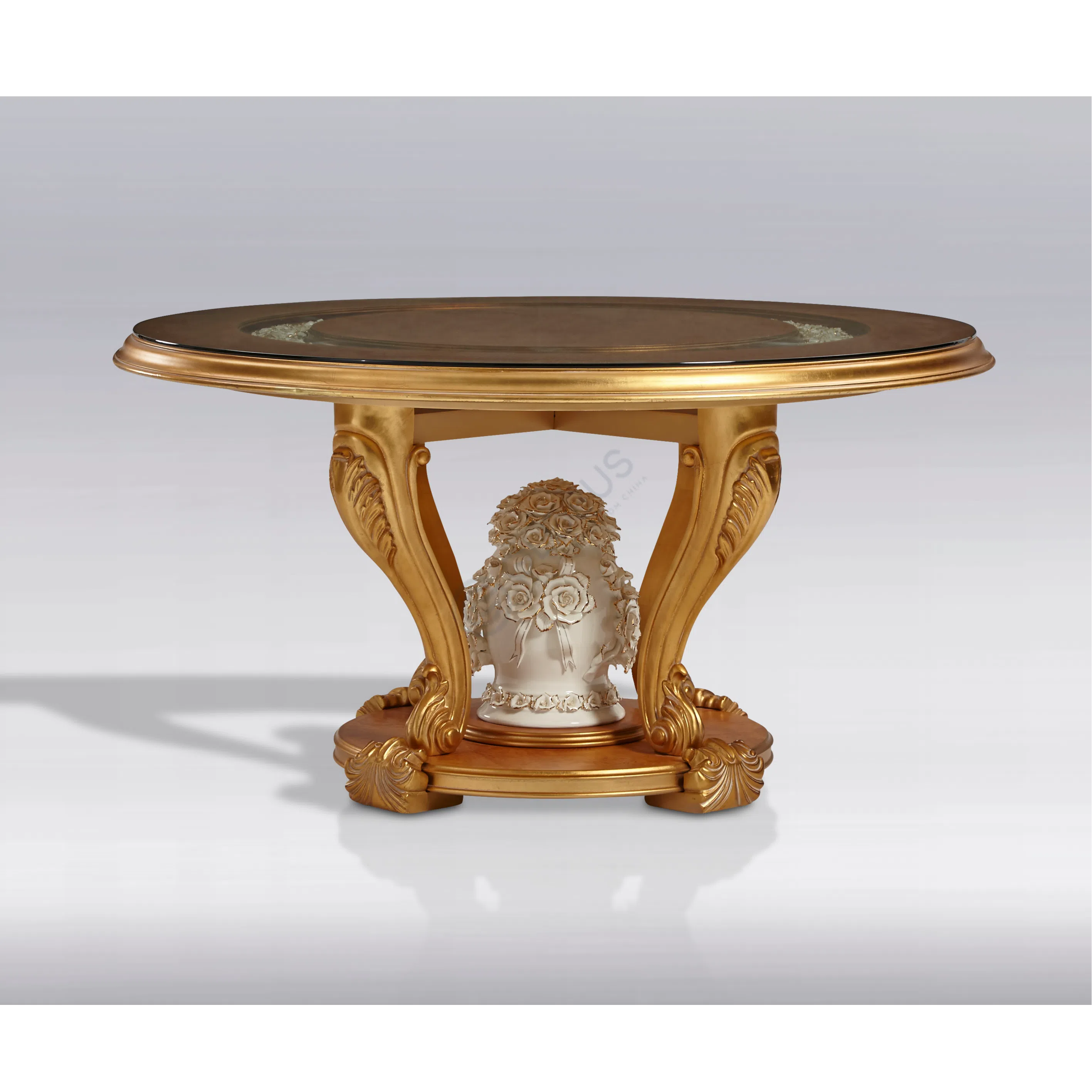 The table features a substantial square top with a smooth surface, likely finished in a natural veneer, offering a warm and inviting look. This top is supported by beautifully shaped legs, crafted from solid wood. These legs exhibit graceful curves and are finished with a golden-toned patina, lending them an air of antique sophistication and depth.