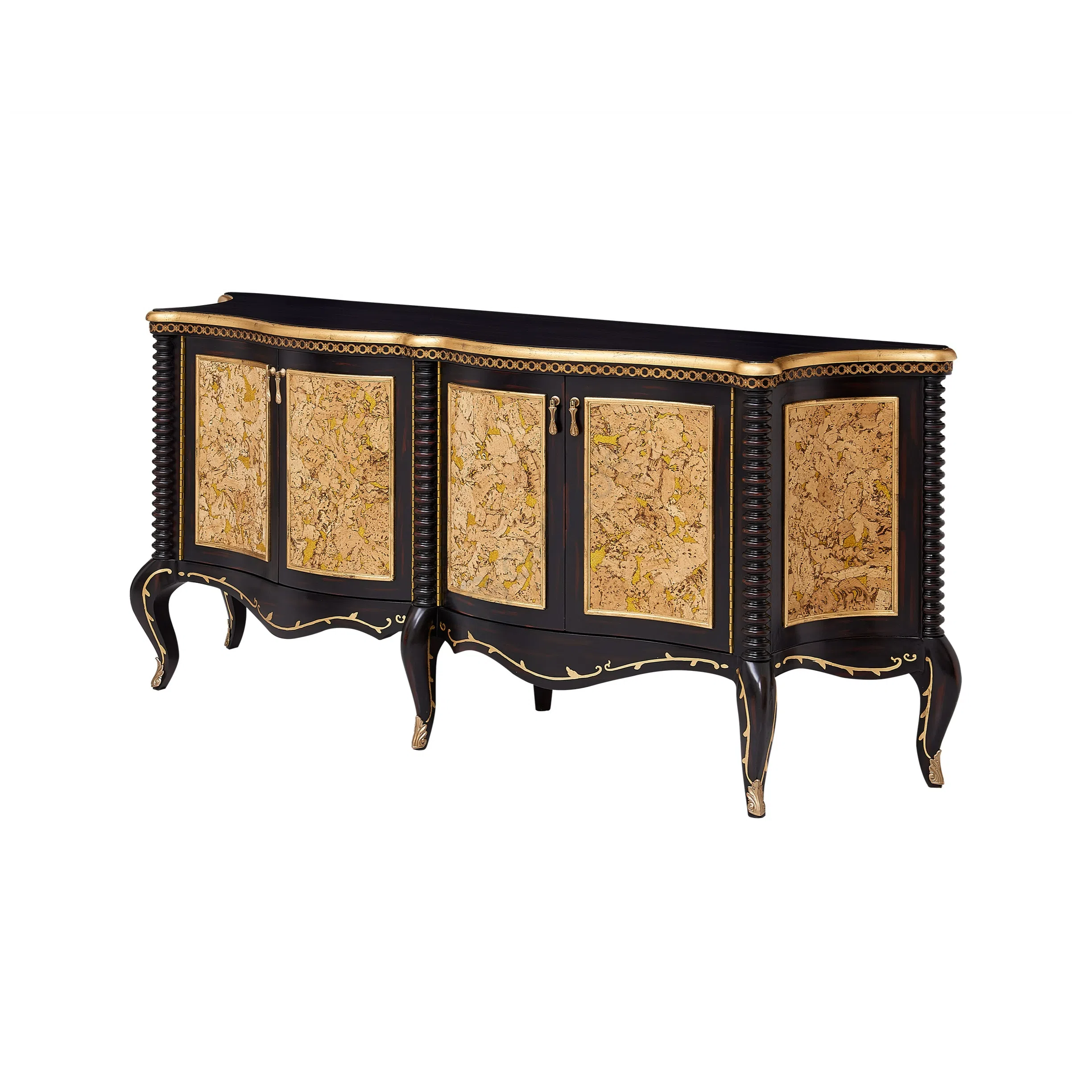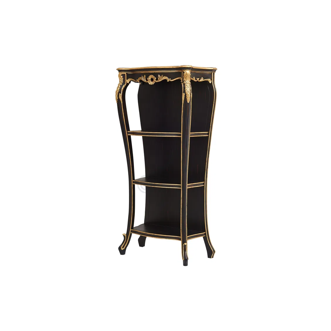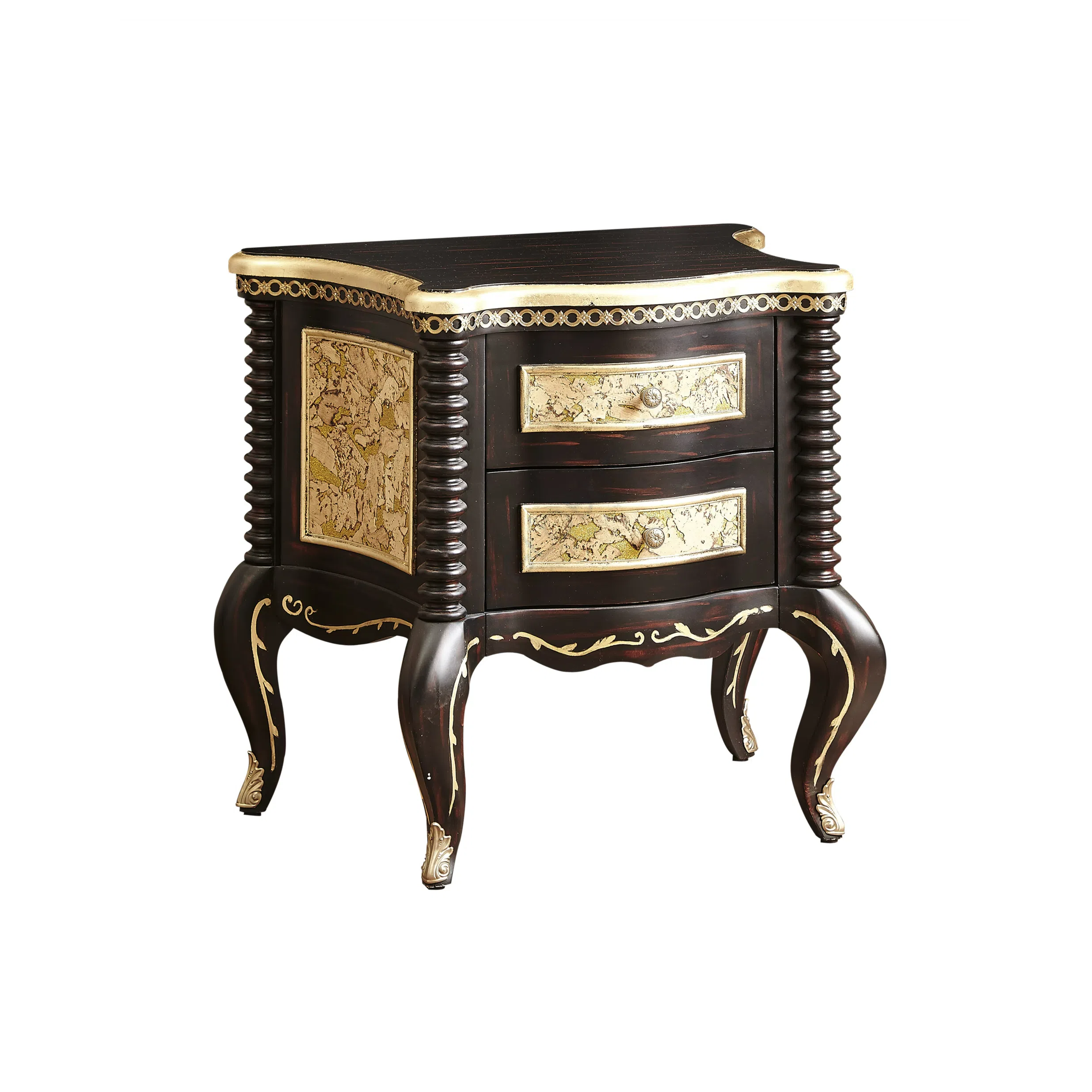 The design features a prominent mirror framed by ornate detailing, providing a clear reflection. Complementing the mirror are small drawers positioned on either side, perfect for organizing smaller items. The main table area has a gracefully curved front, housing additional drawers adorned with decorative handles, adding both beauty and practical storage. Hand-applied gold accents highlight the carved elements and edges, enriching the classic aesthetic.