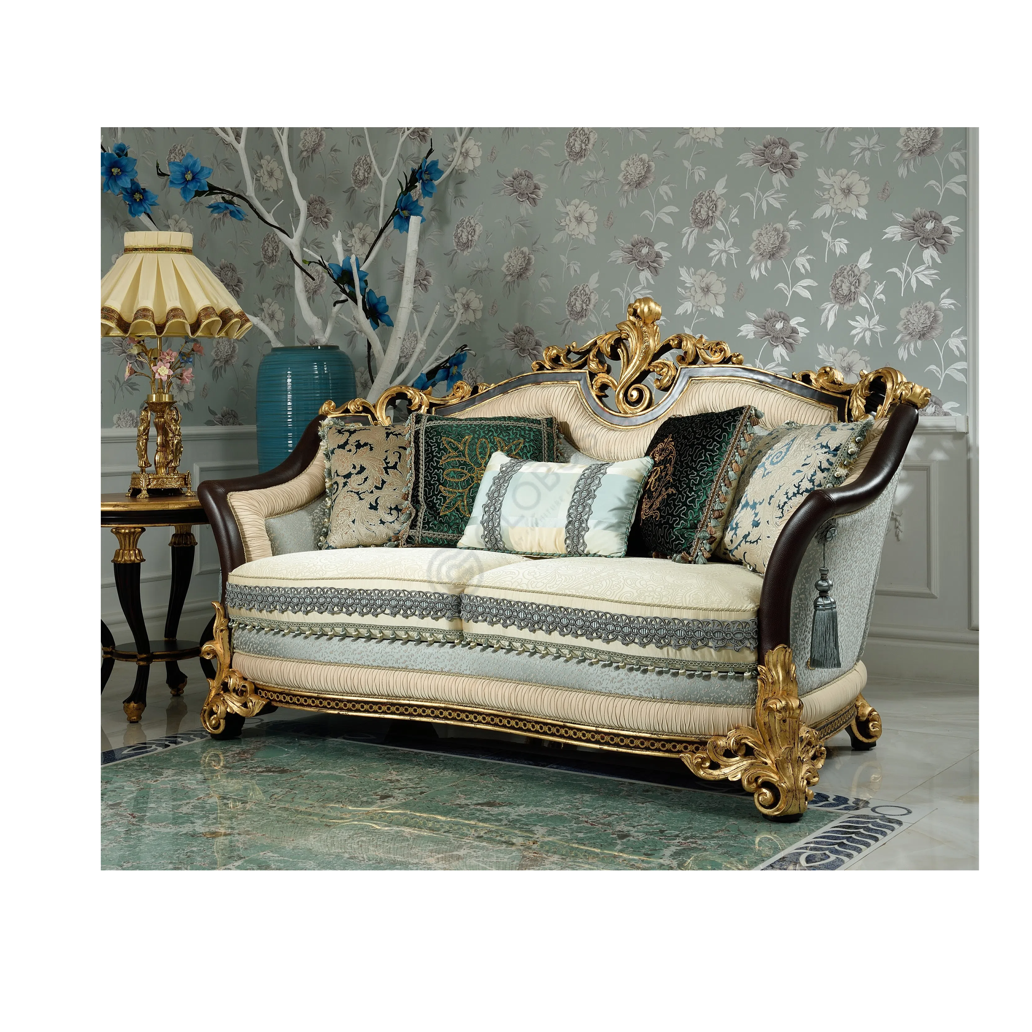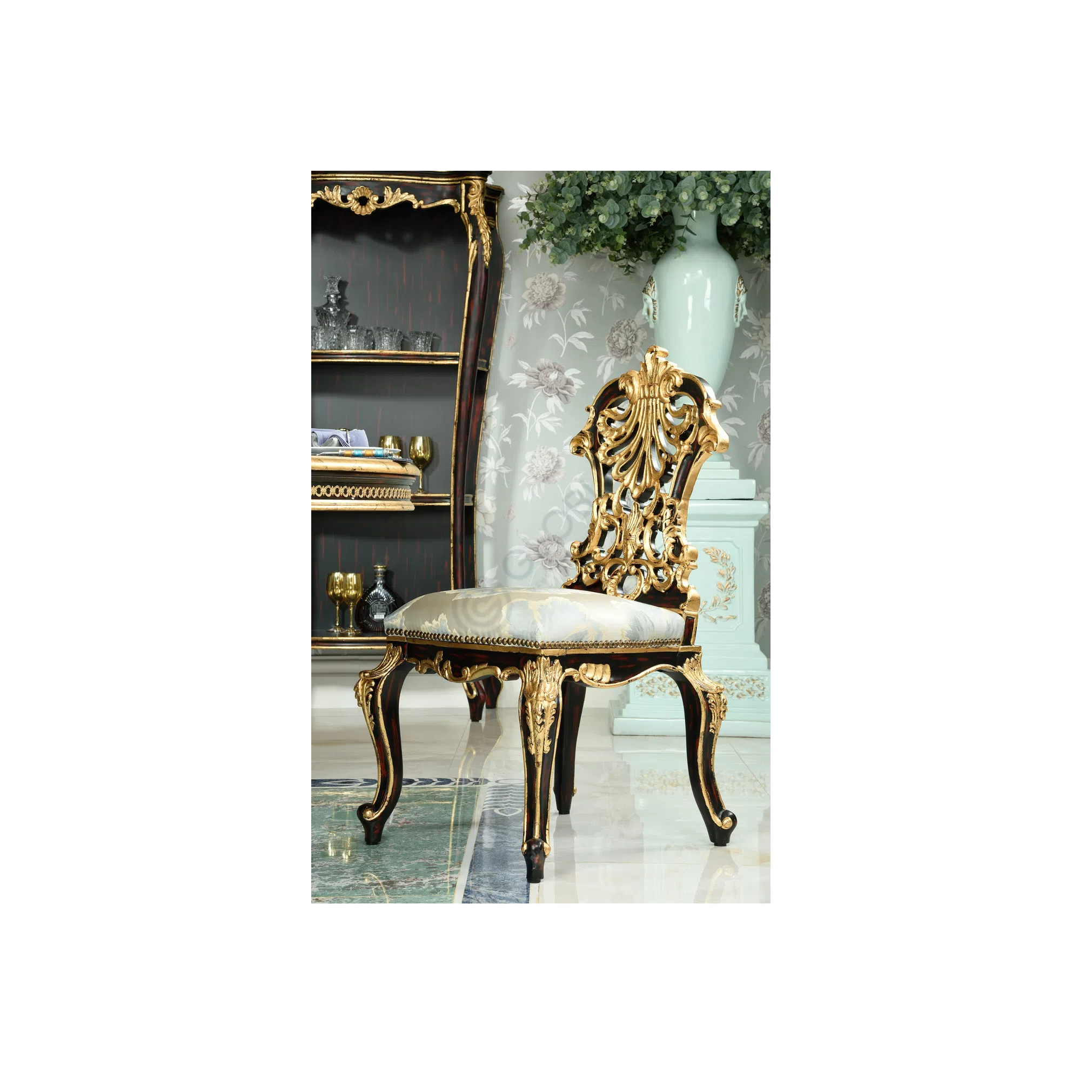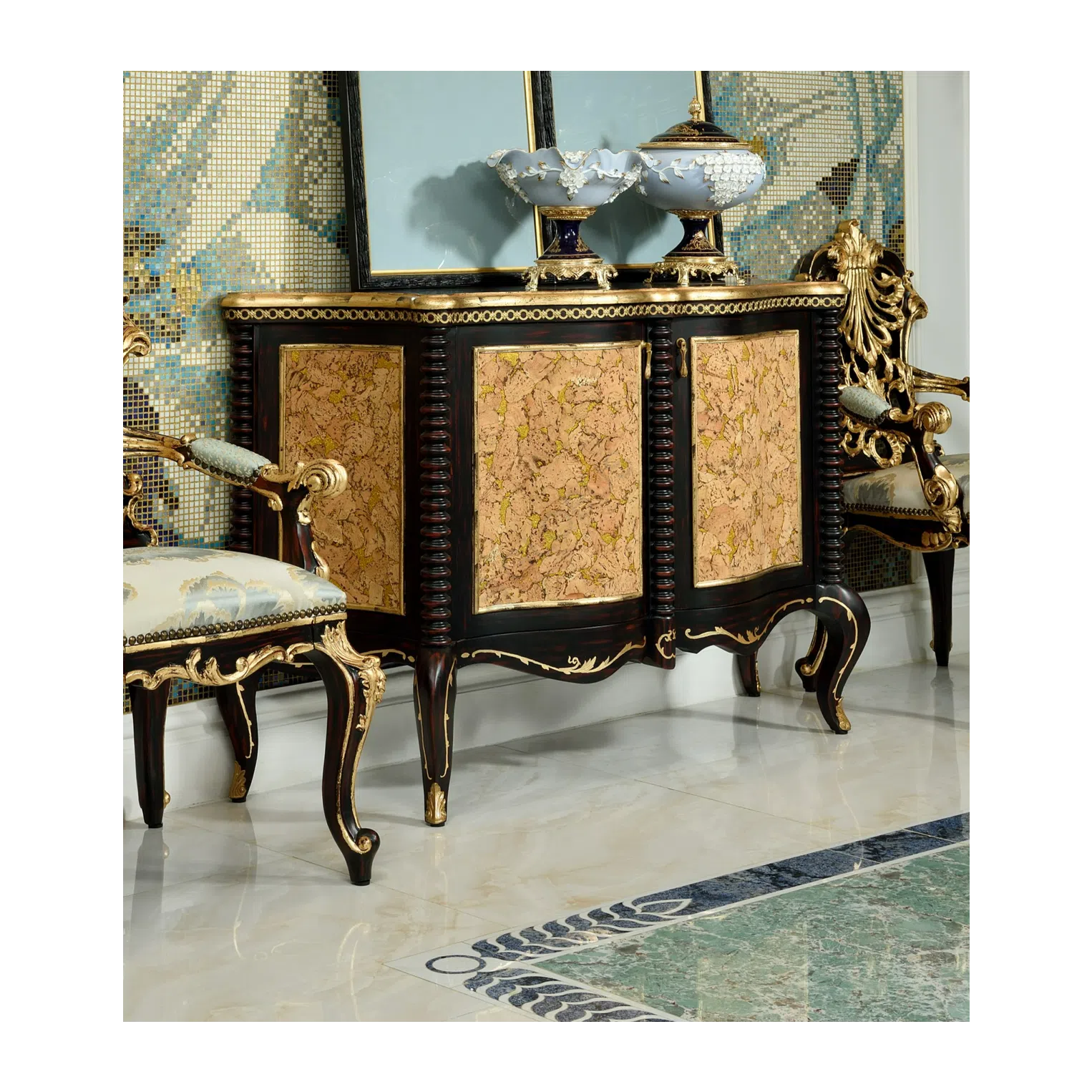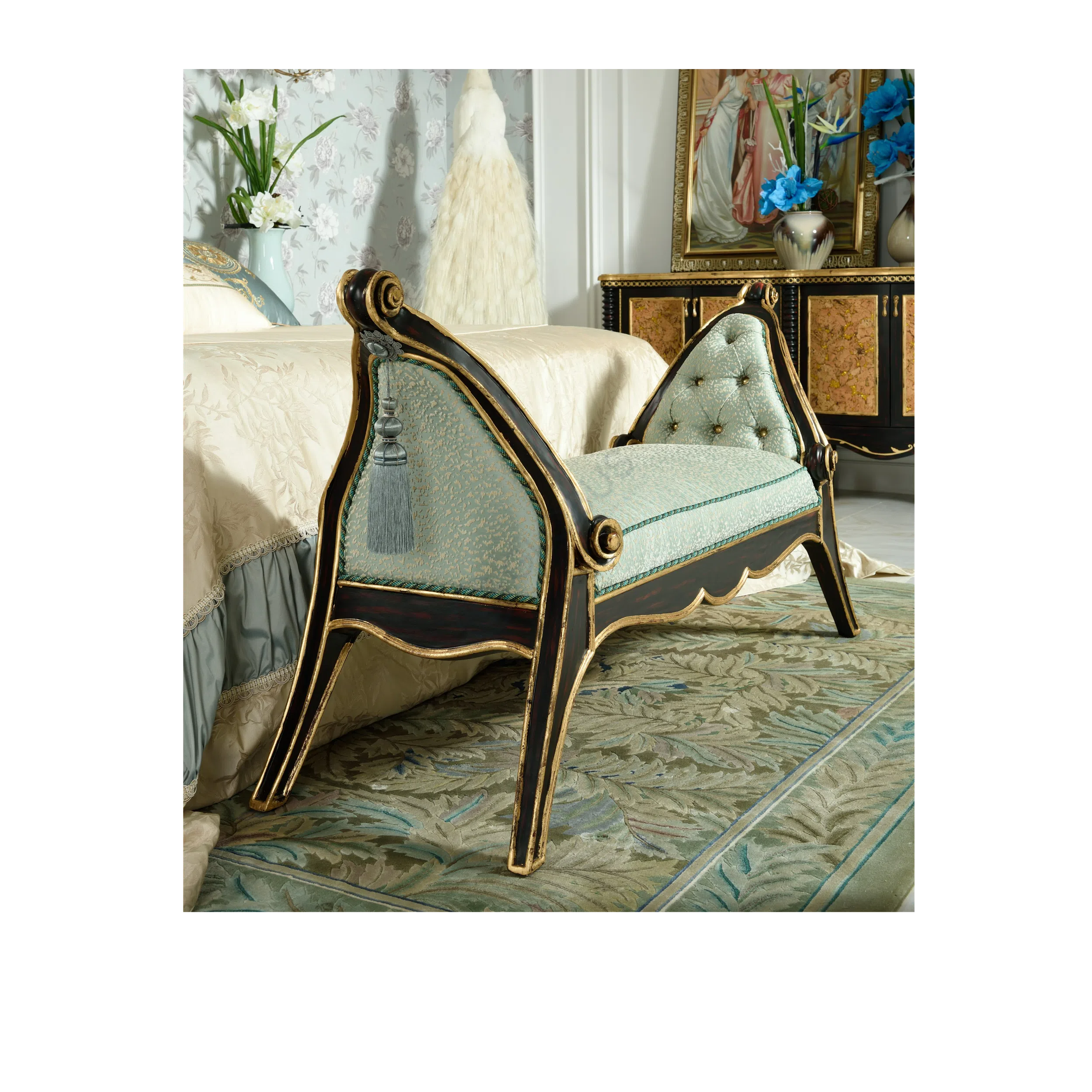 This dressing table serves as a functional and decorative focal point in the bedroom, combining traditional craftsmanship with luxurious materials to create a piece of lasting beauty and utility.