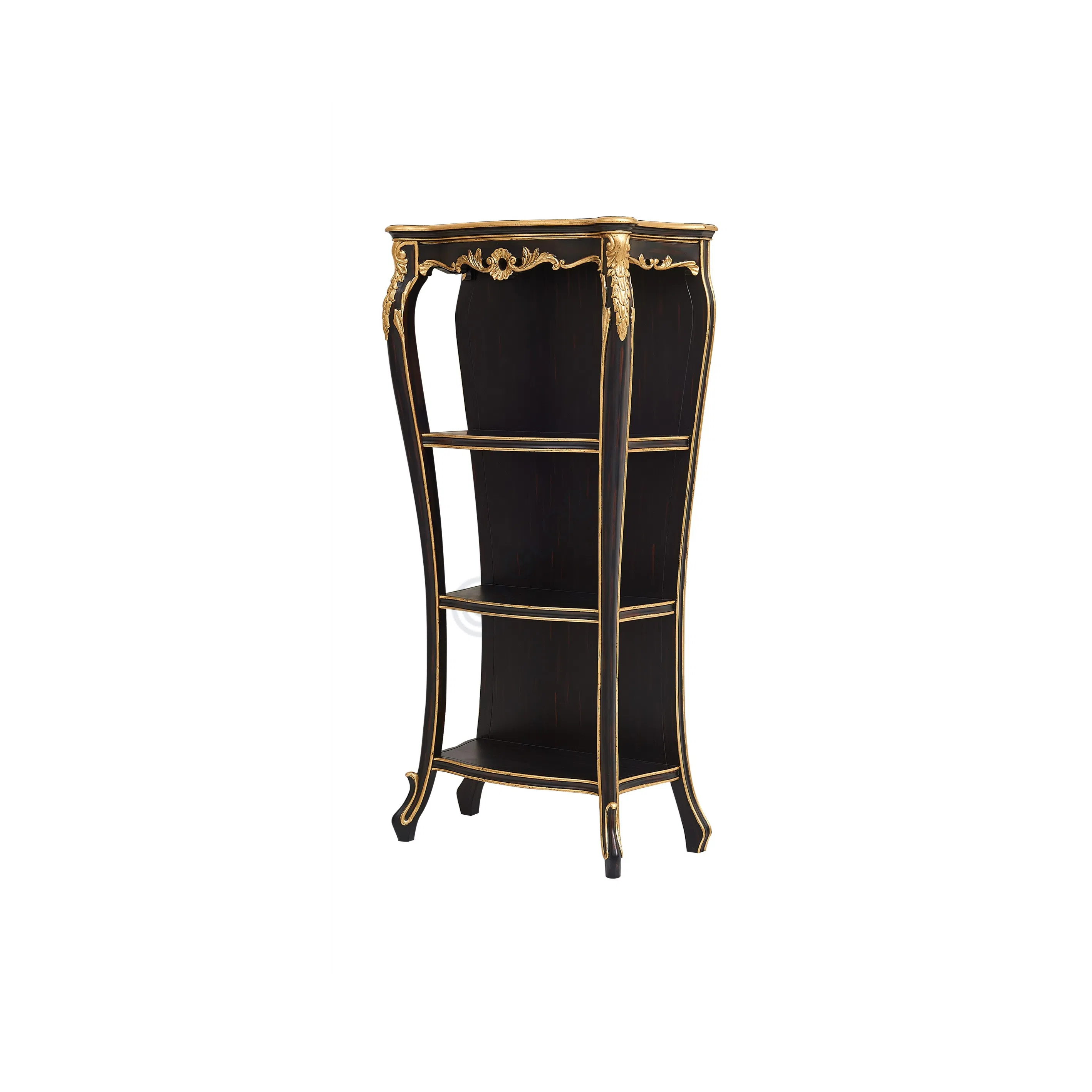 This bookshelf embodies the refined elegance of the European classic style. Its slender silhouette features gracefully curved sides and legs, creating a sense of delicate sophistication. The rich dark finish, enhanced by a subtle patina, provides a luxurious depth, beautifully contrasted by delicate gold-toned accents and ornate carved details that trace its edges and top.