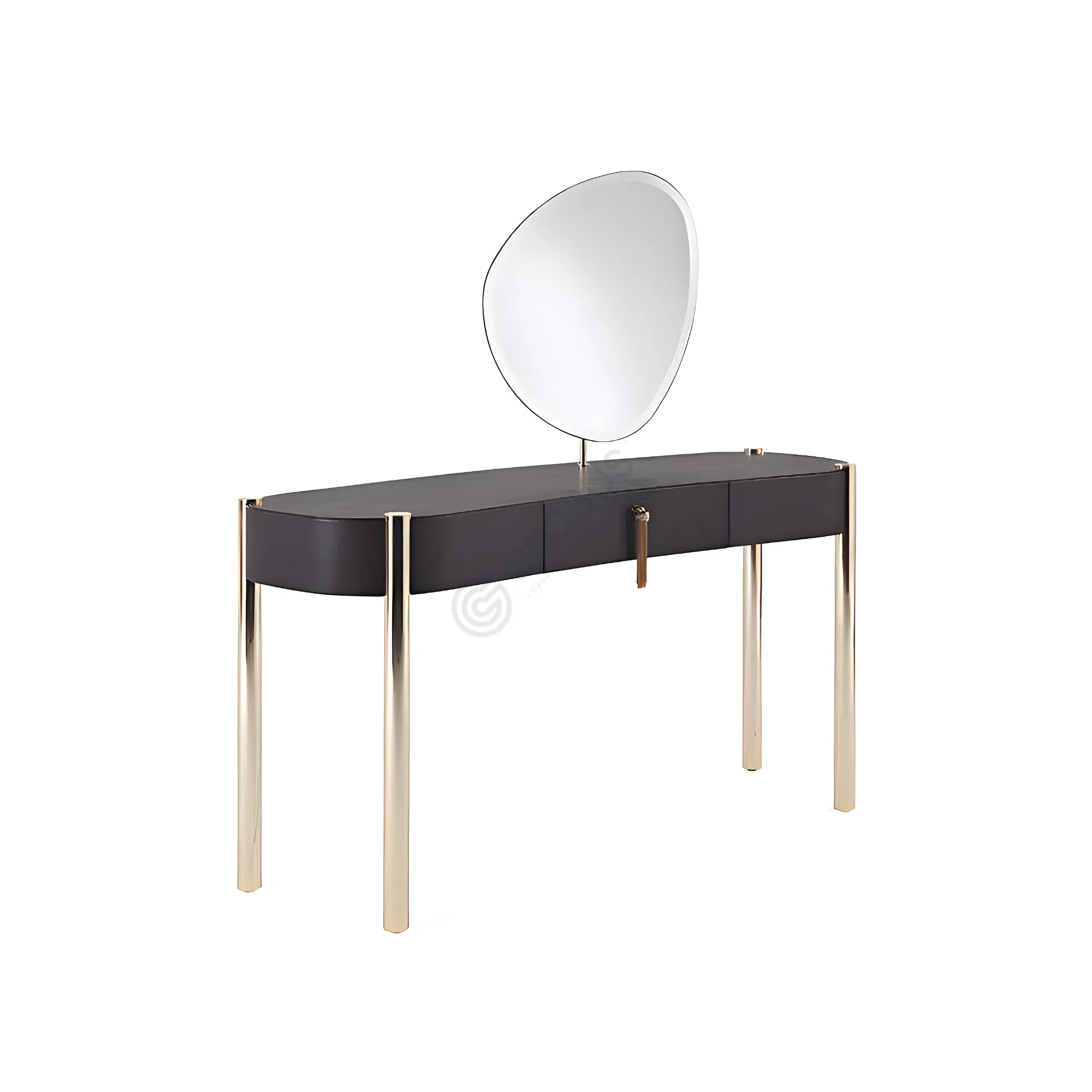 The gracefully curved body of the table is enveloped in luxurious microfiber leather, providing a soft, tactile finish in a subtle, neutral tone. An integrated drawer glides open smoothly, discreetly offering practical storage. It is accented by a distinct, artfully shaped handle that serves as a refined visual detail.