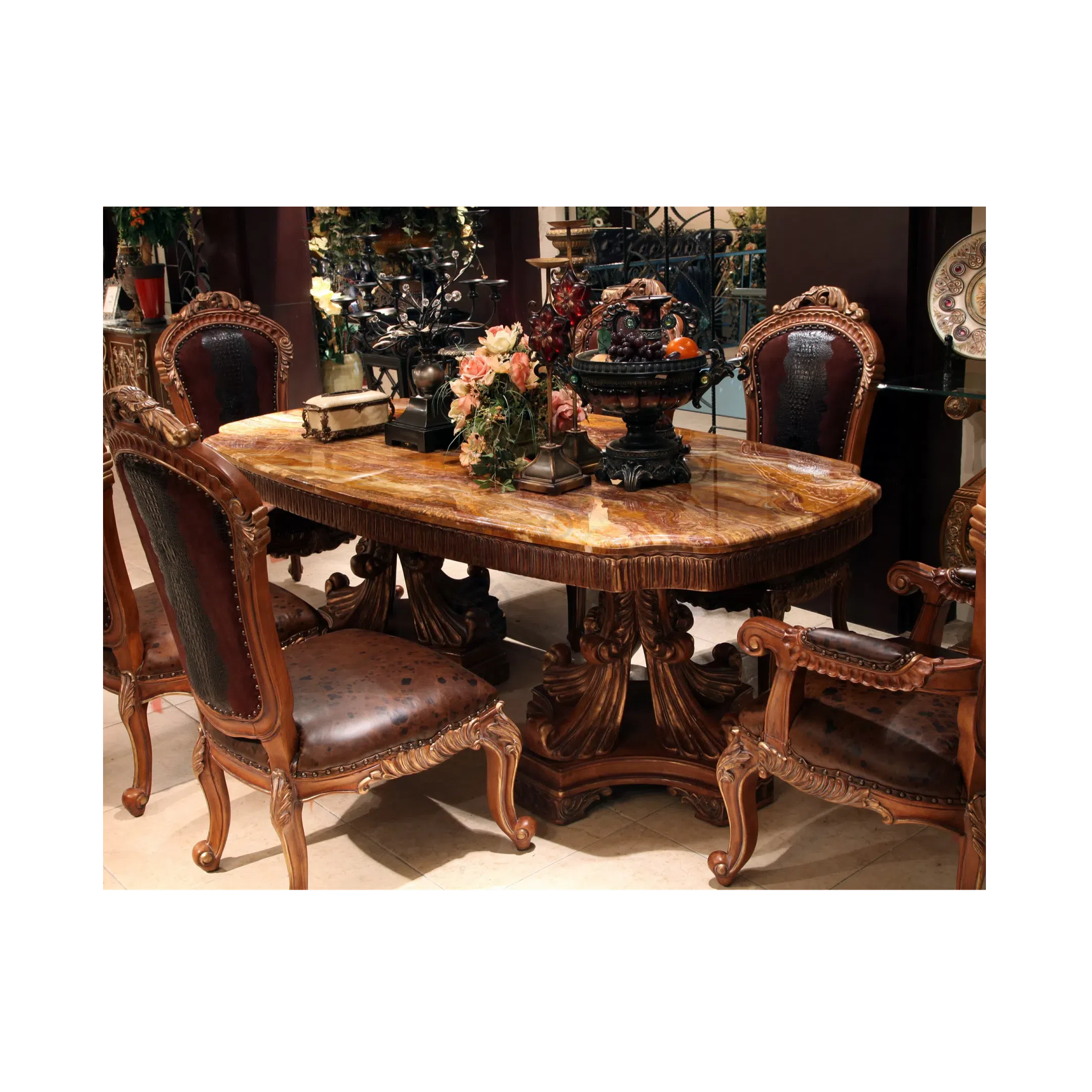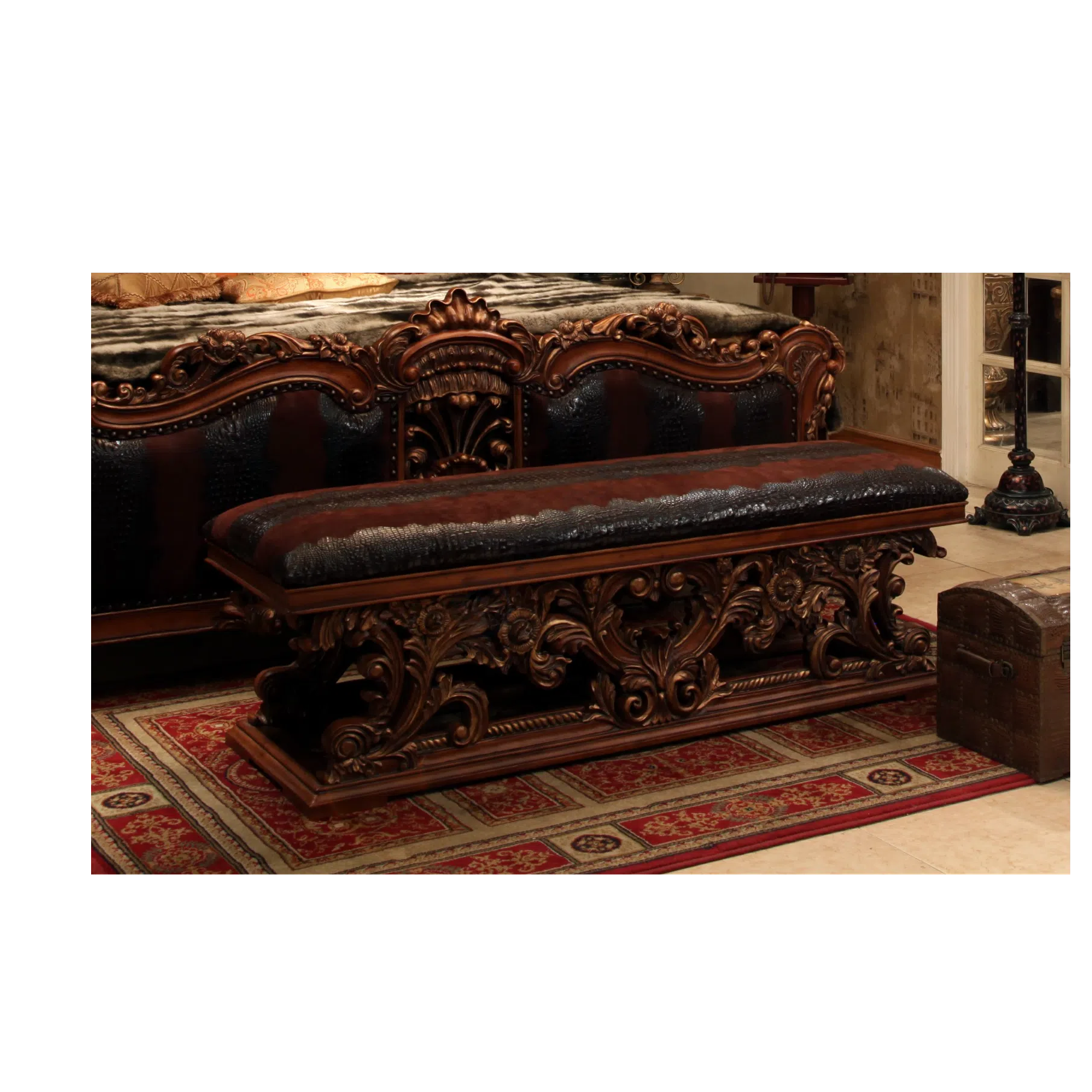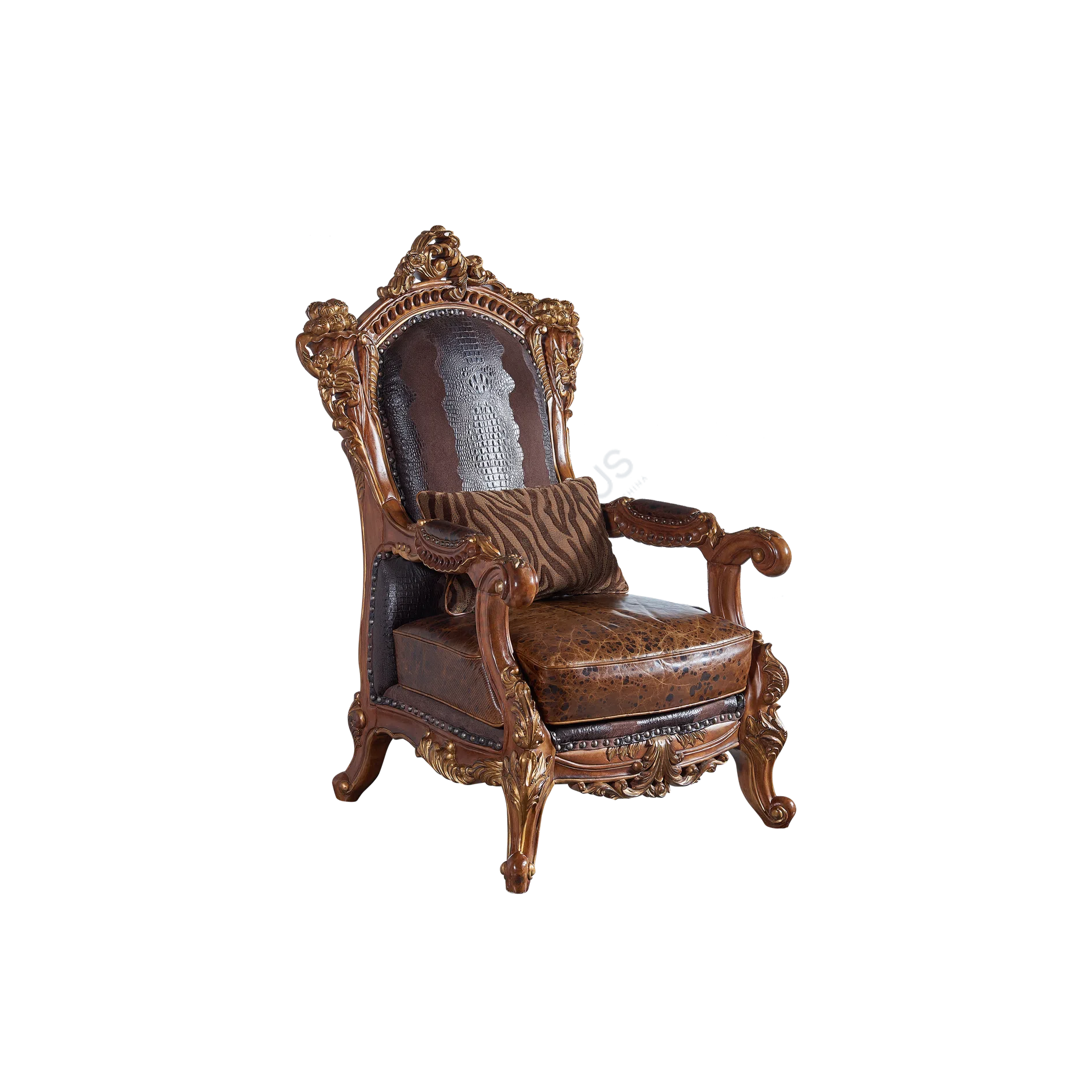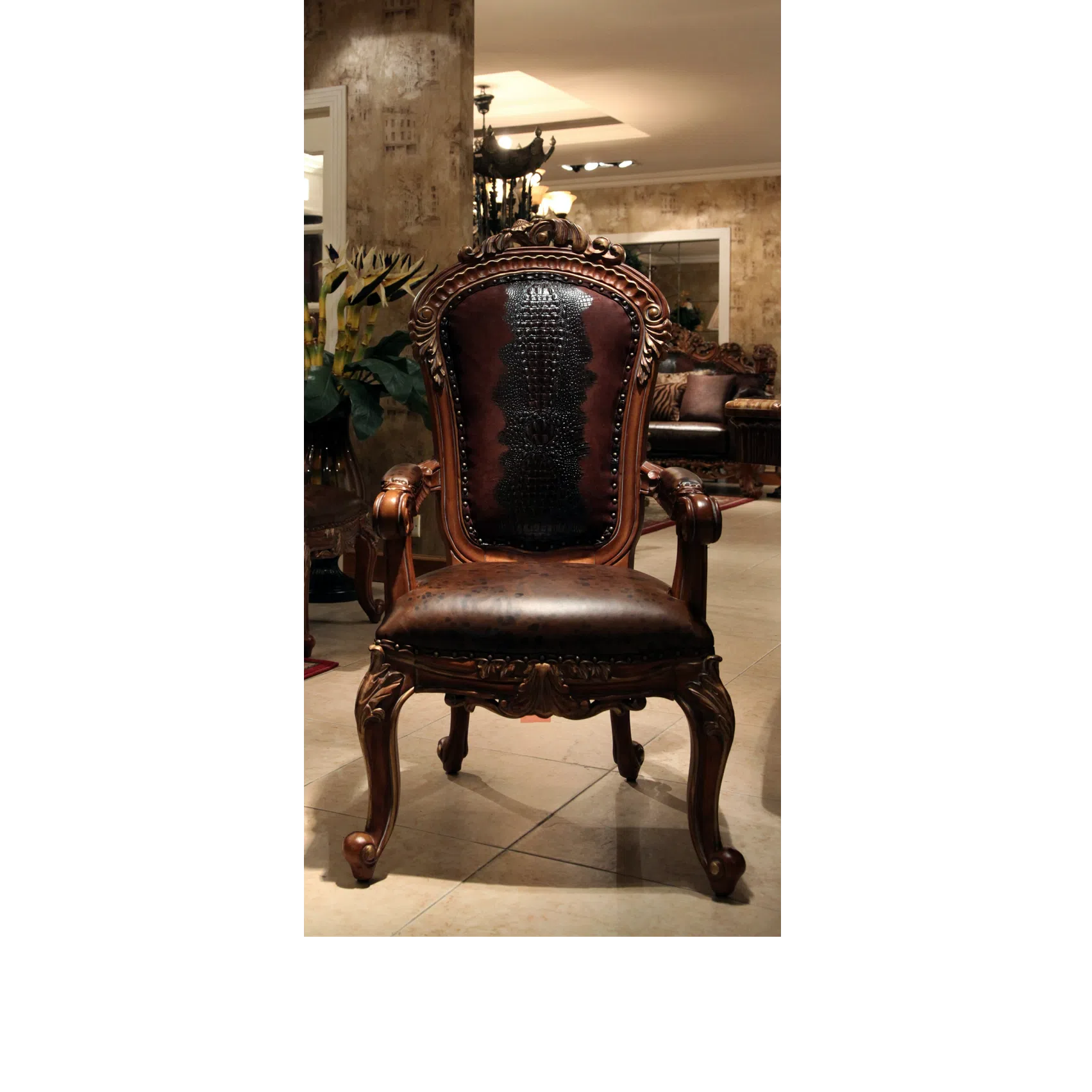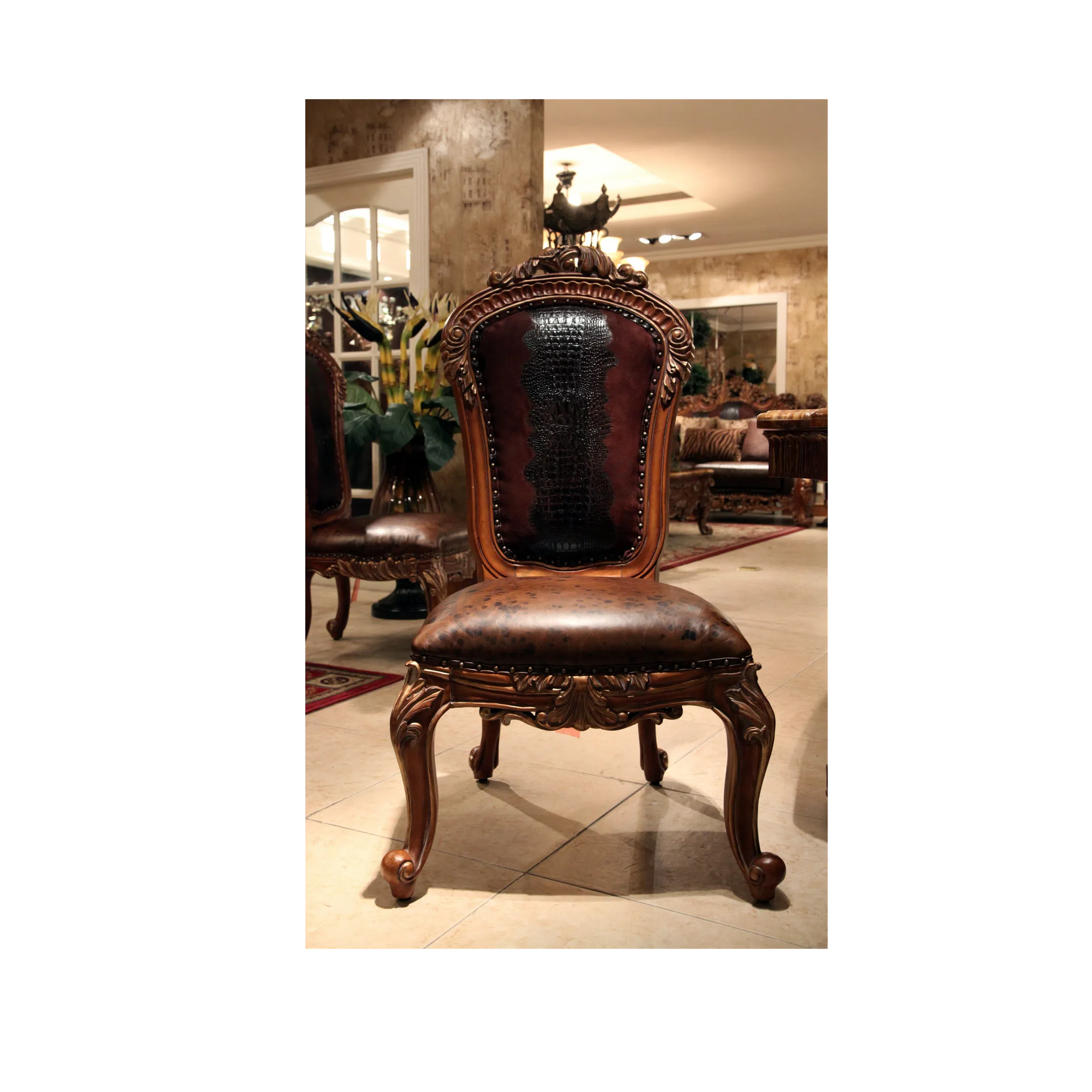 Upholstered in premium leather, the seating area presents a rich brown hue with a textured finish. A contrasting patterned leather is used on the upper backrest, providing a distinct visual element. The elaborate wood frame benefits from a skilled application of patina, highlighting the details of the carving and enhancing its aged character.