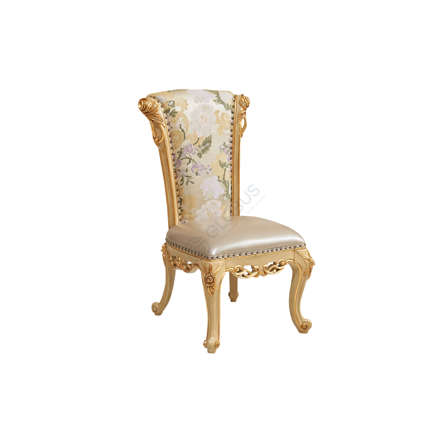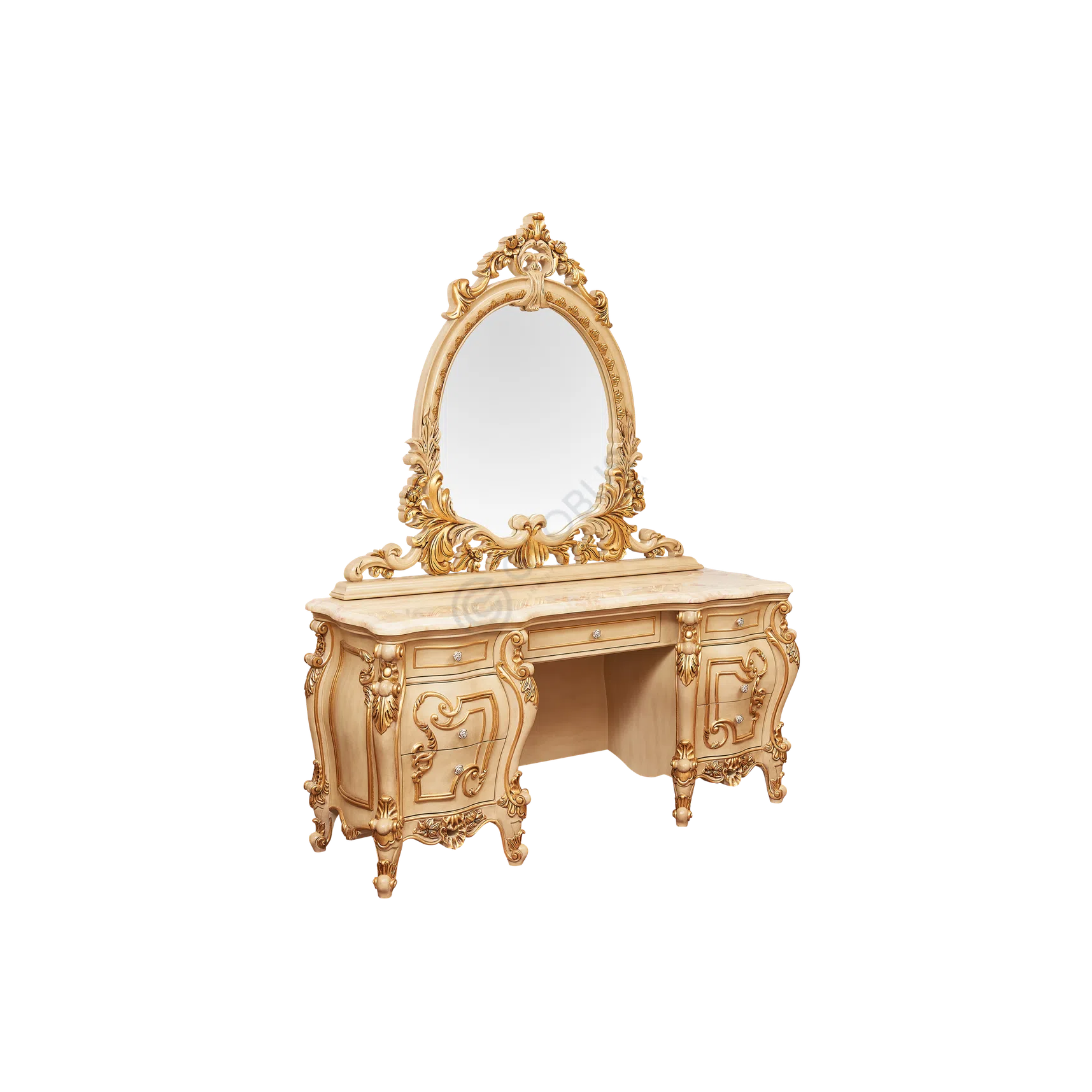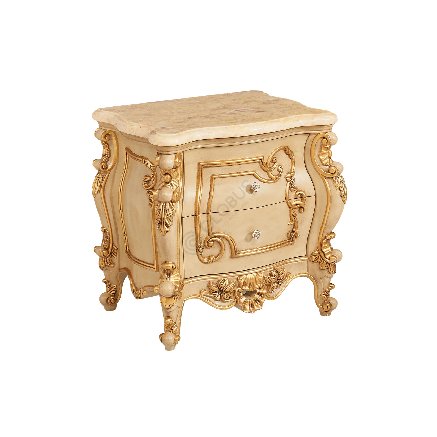 This sideboard presents a graceful silhouette inspired by European classic design. Its elegant, curved form is finished in a soft, patinated cream tone, beautifully accented by rich gold detailing.