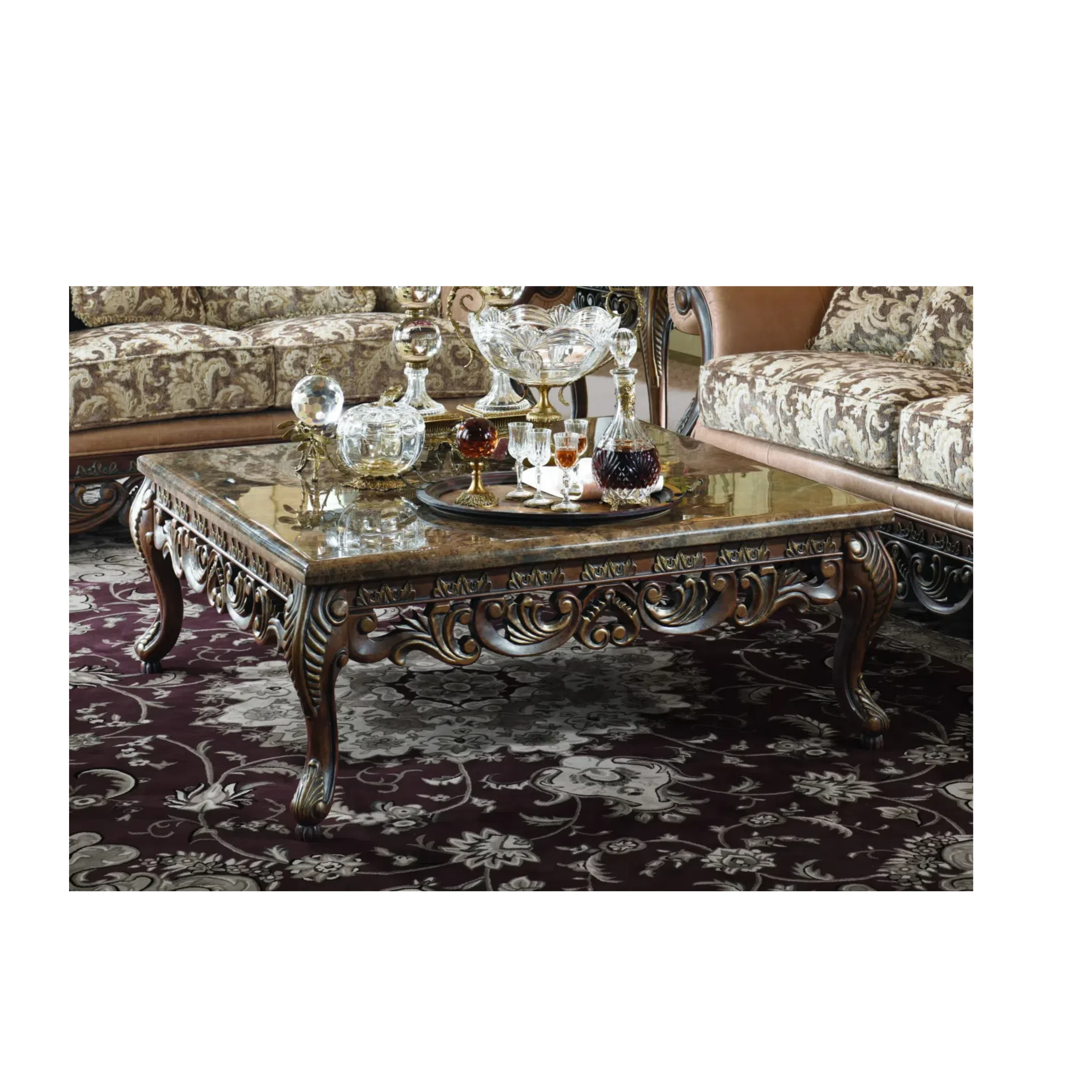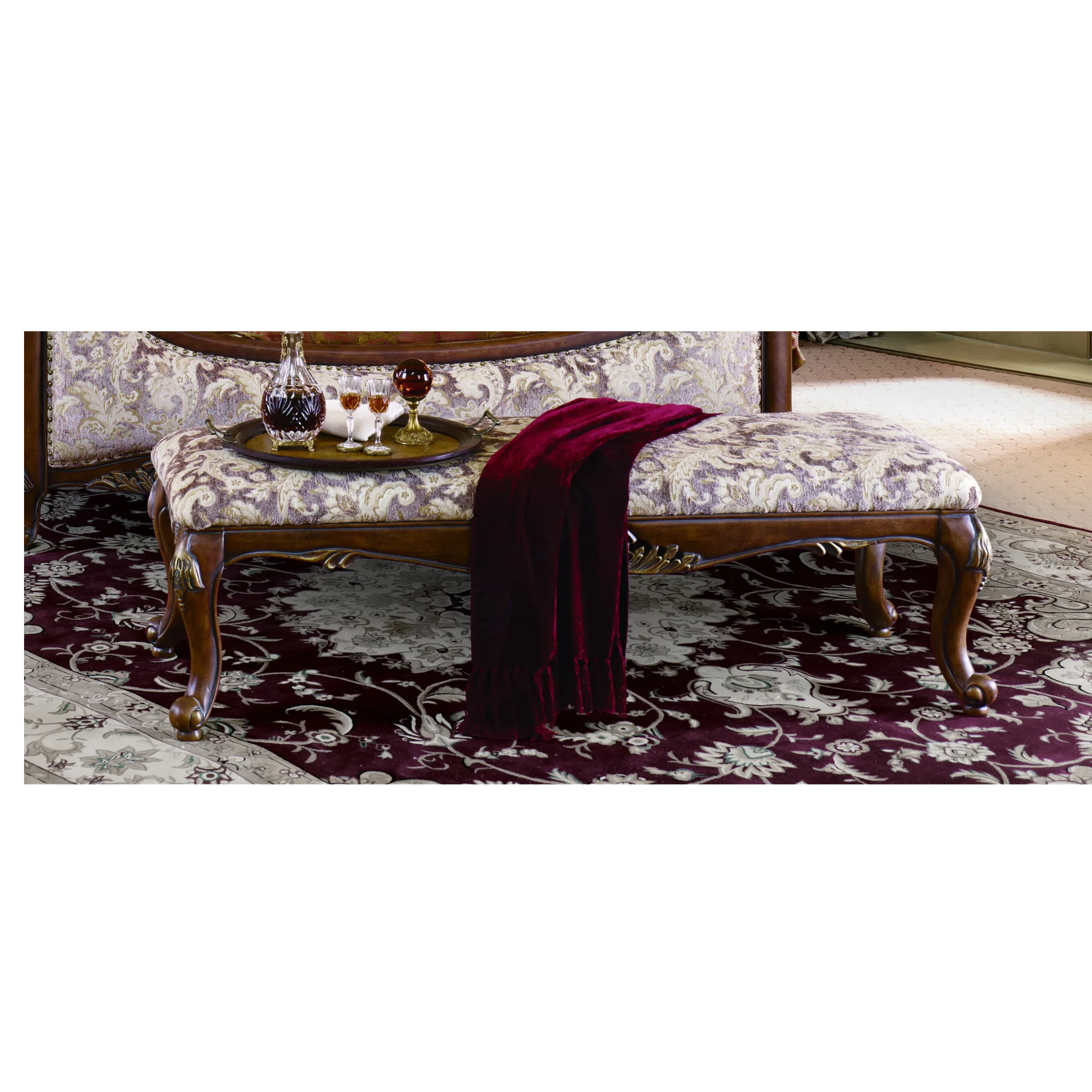 The headboard and footboard are sumptuously upholstered in fine textile, featuring an intricate pattern that complements the classical lines of the bed. Elegant carvings adorn the frame, highlighting the craftsmanship and adding touches of ornate beauty characteristic of the style. This combination of materials and design elements results in a piece that is both visually stunning and durably constructed.