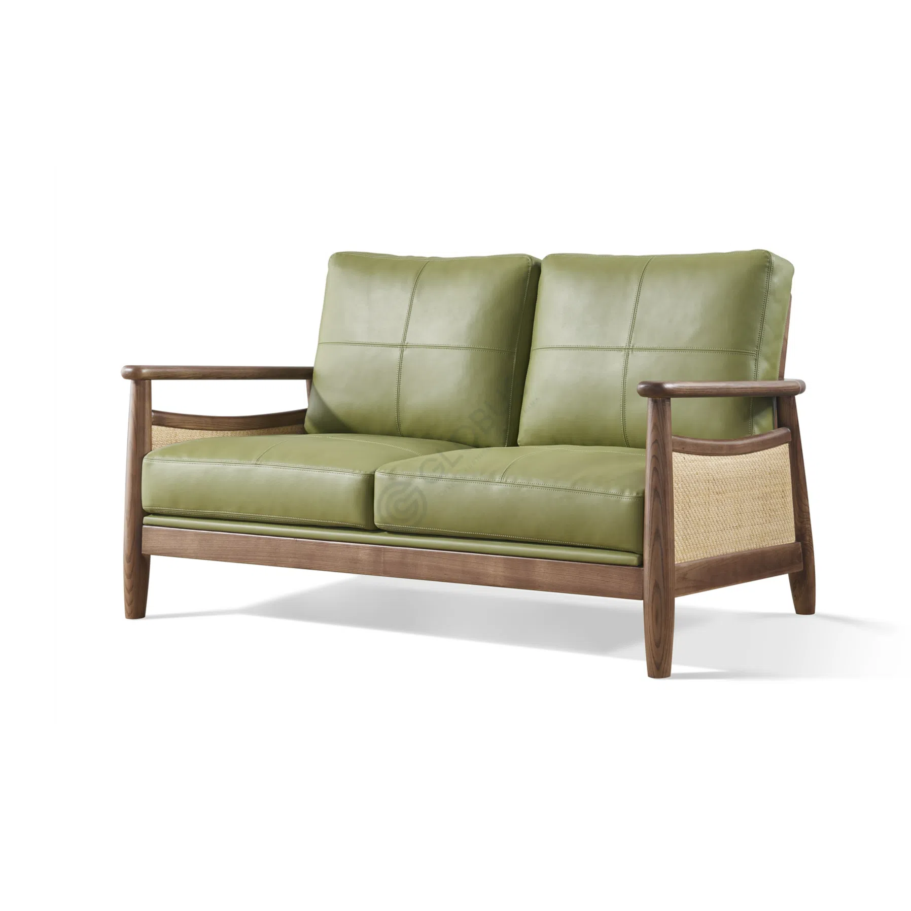 Crafted with a robust solid wood frame, this piece ensures stability and lasting quality. The sides feature panels of natural rattan, adding a unique texture and a touch of artisanal craftsmanship. This detail not only enhances the visual appeal but also nods to eco-friendly design principles. The seat and back cushions are generously upholstered in soft microfiber leather, offering a comfortable and easy-to-maintain surface.