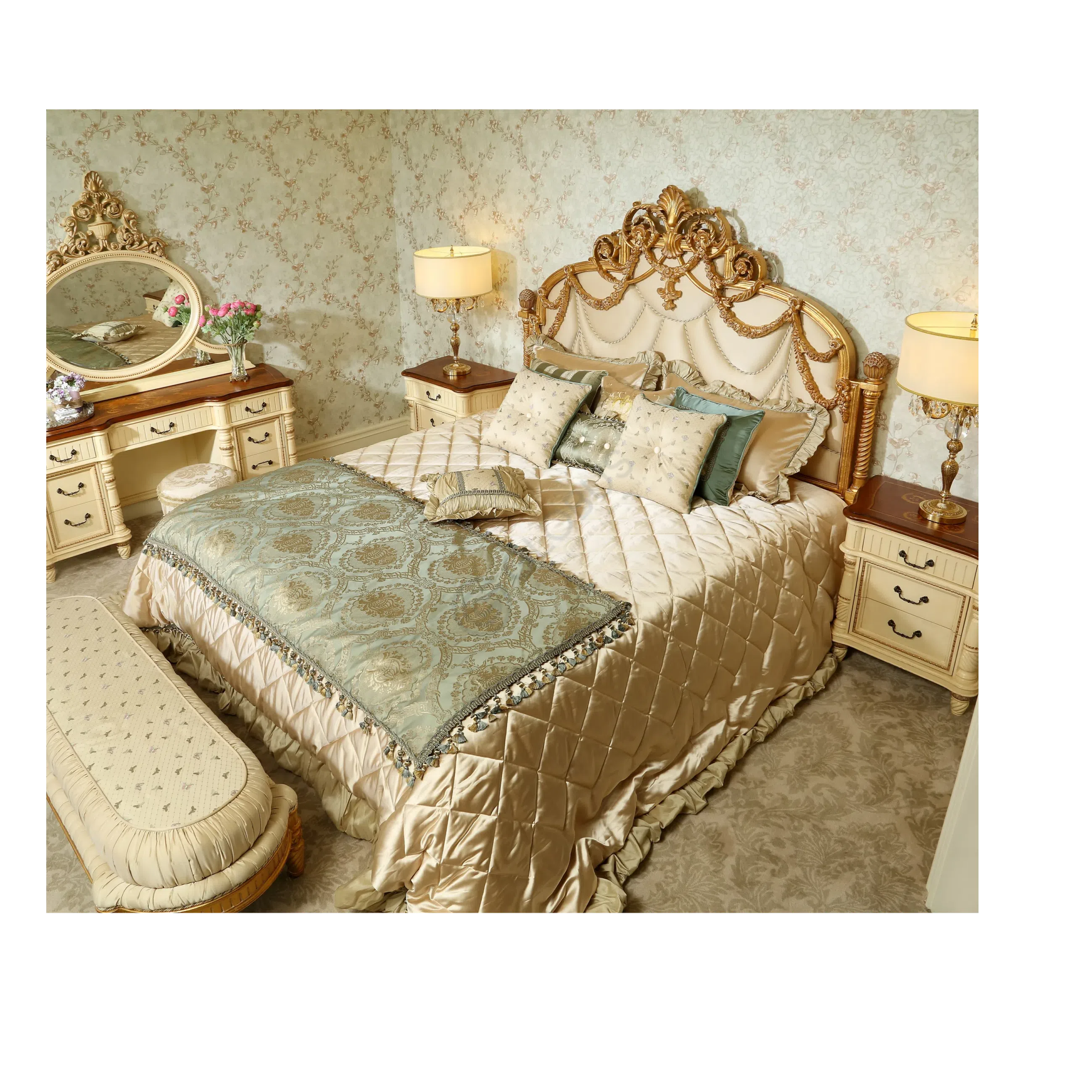 Crafted with a foundation of solid wood and sturdy plywood, this table showcases expert artistry. The intricate details on the base and legs, including delicate carvings, are subtly highlighted with touches of gold foil, embodying traditional European design sensibilities.