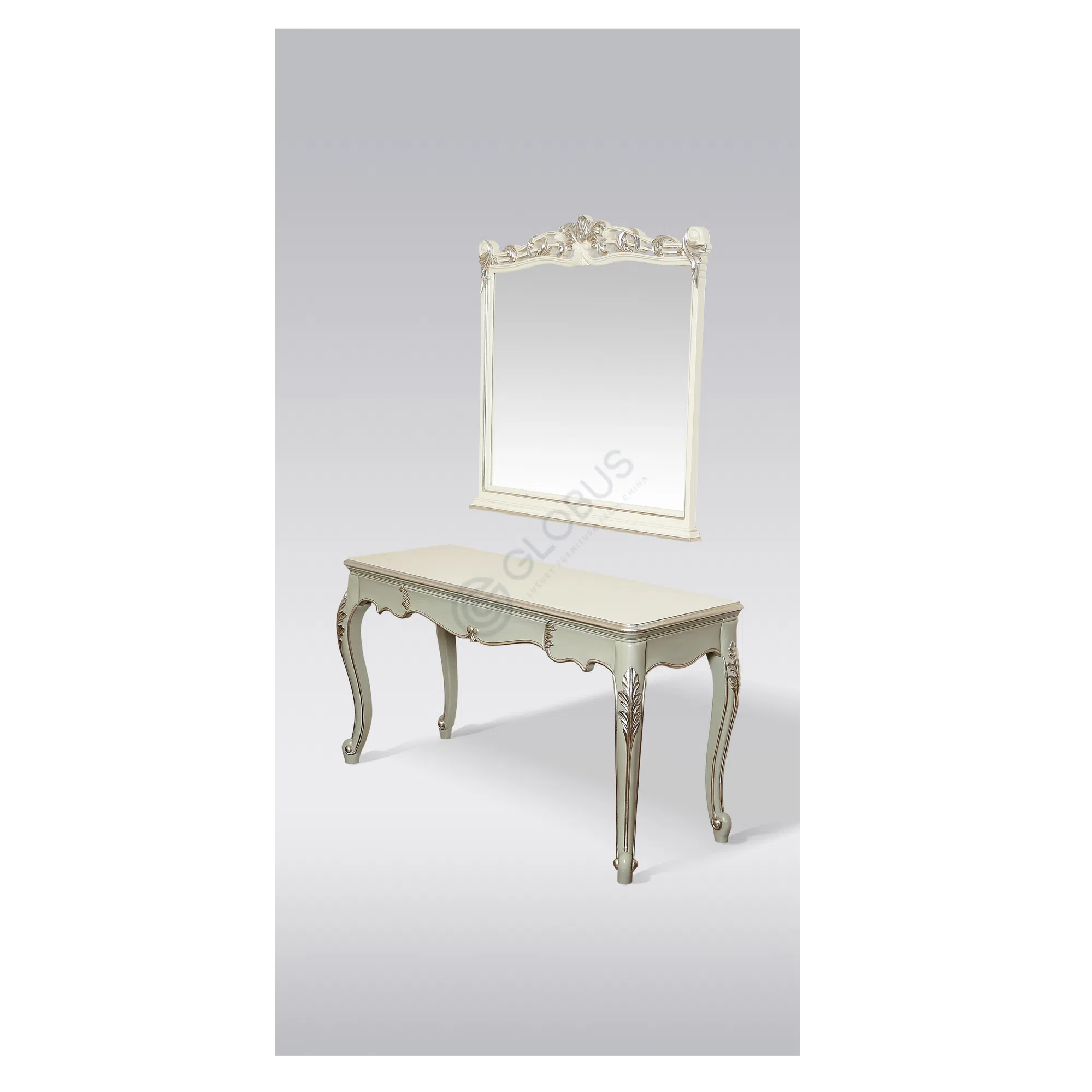 The table features a smooth, rectangular top with a subtle border. It is supported by four gracefully curved legs, detailed with classic carving motifs. A delicate patina finish enhances these sculptural elements, adding depth and character to the overall aesthetic.