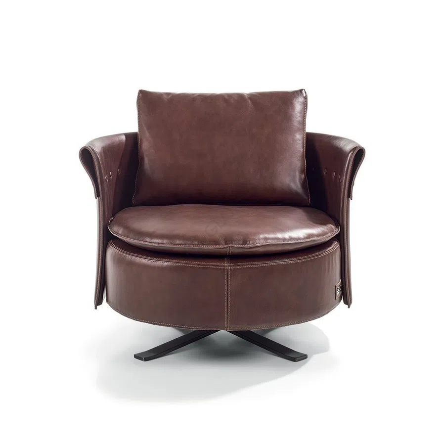 Upholstered in richly grained saddle leather, the surface develops a warm patina over time while remaining easy to maintain. A polished stainless steel plinth grounds the piece with a hint of metallic sheen, and a robust steel frame ensures lasting stability.