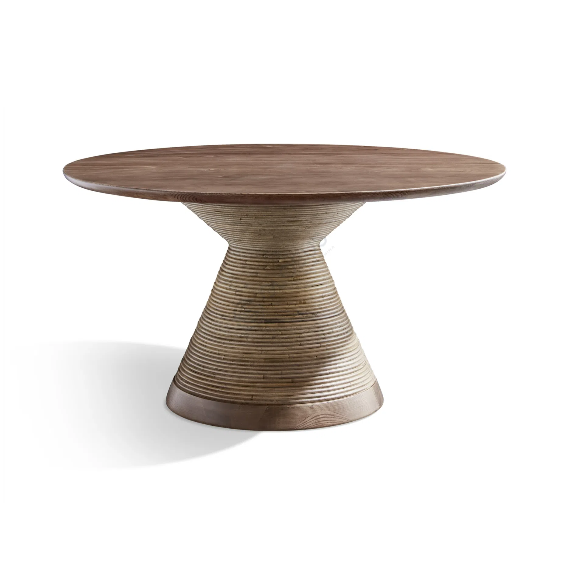 The warmth of the wood is enhanced by the delicate, handwoven natural rattan that wraps around its unique hourglass frame, adding a touch of organic texture that is both pleasing to the eye and touch. The sturdy, broad tabletop offers ample space for your favorite books, decorative items, or a cozy afternoon coffee setup.