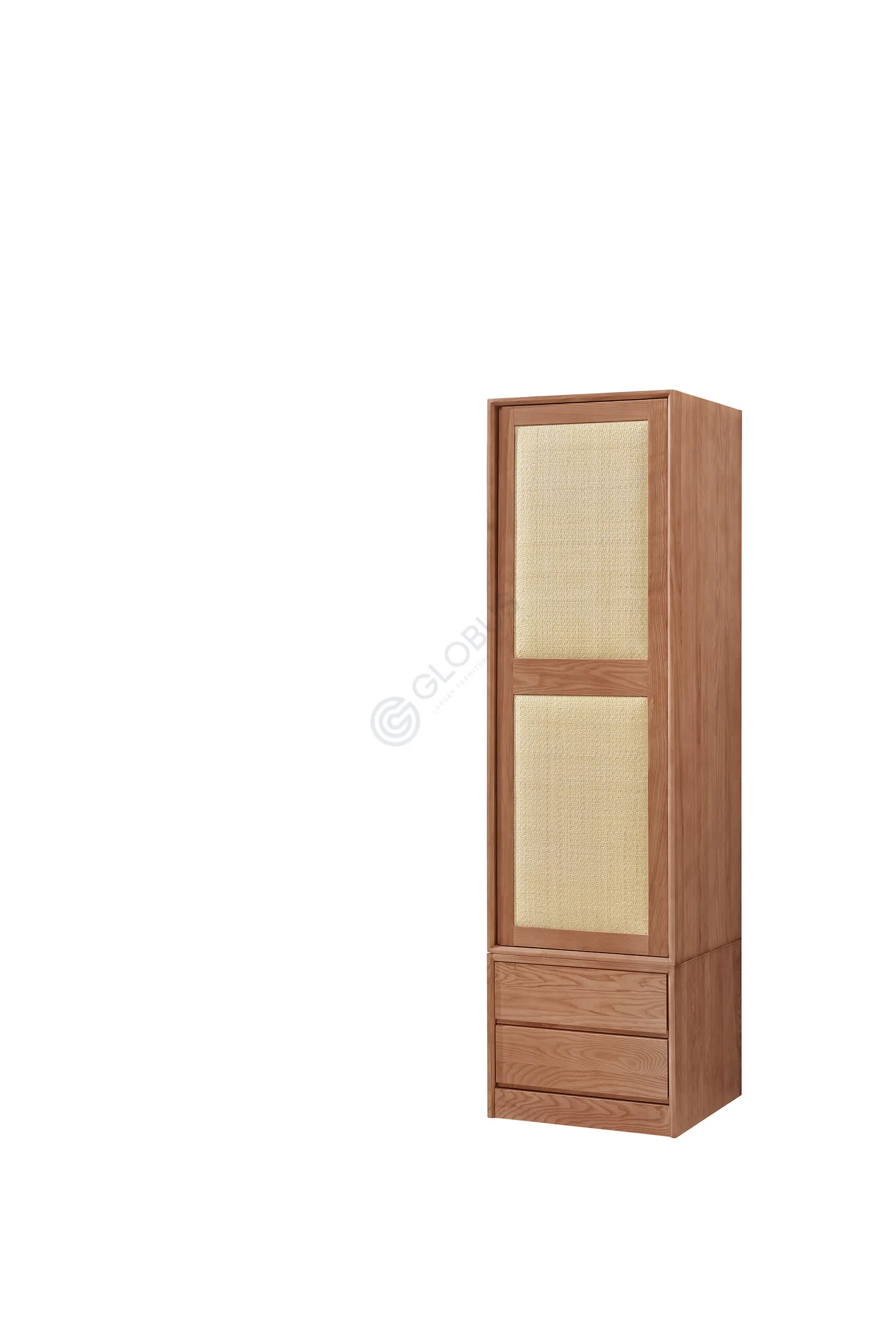 This bedroom shelf offers a refined blend of modern design and natural comfort. Crafted from solid wood, its clean lines are beautifully complemented by a natural rattan panel, creating an inviting piece that speaks to contemporary eco-style aesthetics.