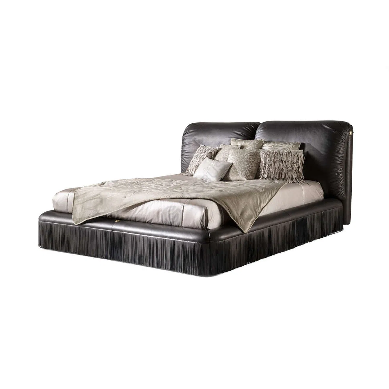 The design features softly gathered arms adorned with elegant tassels and a decorative gold-finish accent. Upholstered in high-quality microfiber leather, the surface provides a smooth touch and subtle sheen in a refined color.