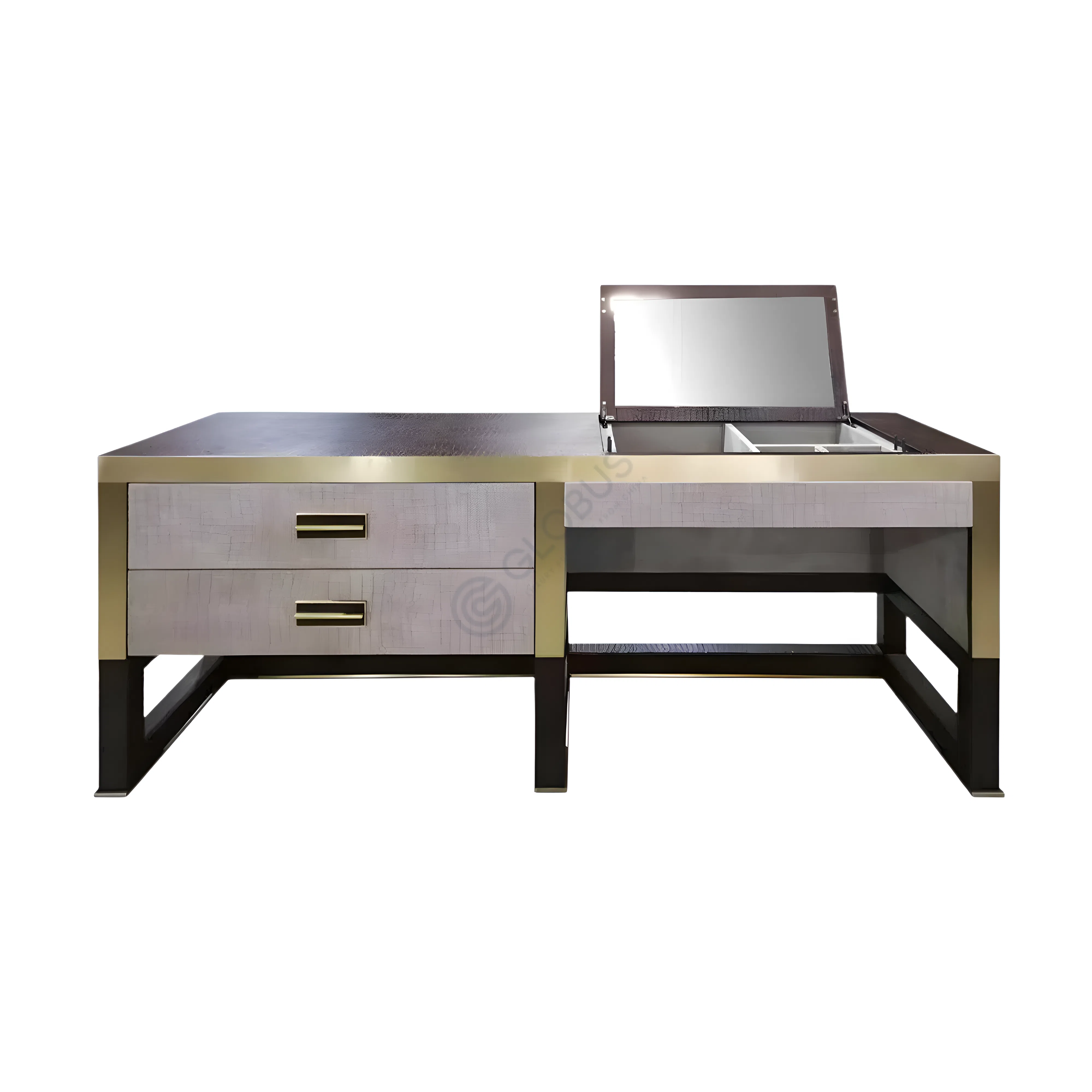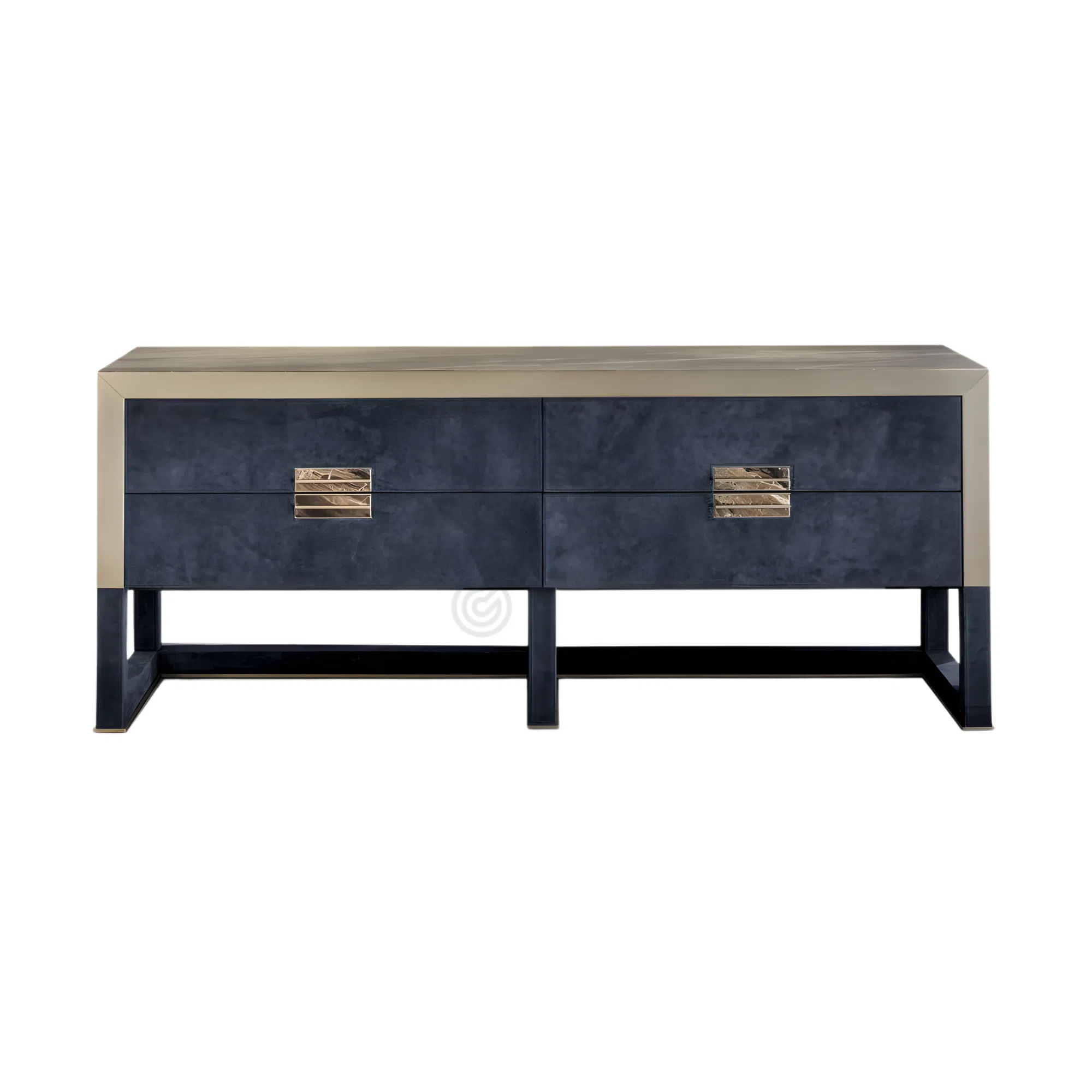 This TV stand features conveniently designed drawers, providing ample storage for media devices, game consoles, or miscellaneous items, helping to keep your space organized. With stainless steel accents, it seamlessly blends contemporary aesthetics with timeless design.