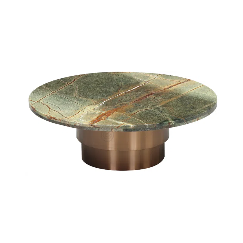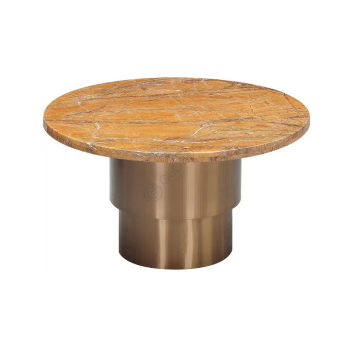 The table's silhouette features a cylindrical base with a gentle, reflective sheen, complementing the luxurious marble surface. The marriage of these fine materials not only ensures durability but also imparts a sense of understated opulence to any room.