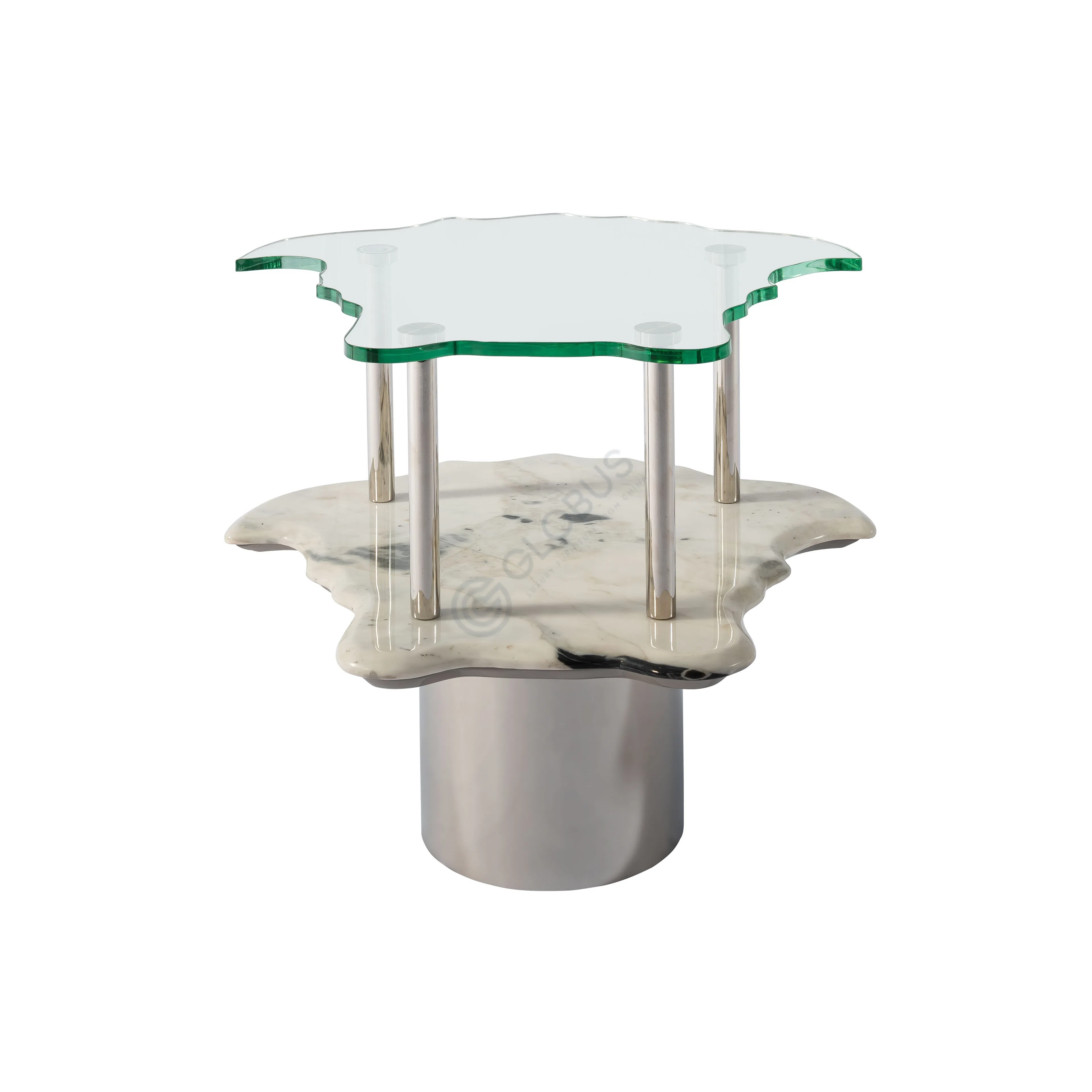 The table features a unique two-tiered arrangement. Its lower level, crafted from natural marble, showcases an organically sculpted edge that flows with a subtle, irregular grace. Above it, a clear glass top mirrors this fluid outline, creating an elegant visual rhythm. Polished stainless steel pillars delicately bridge these two surfaces, contributing to the table's open and airy feel.