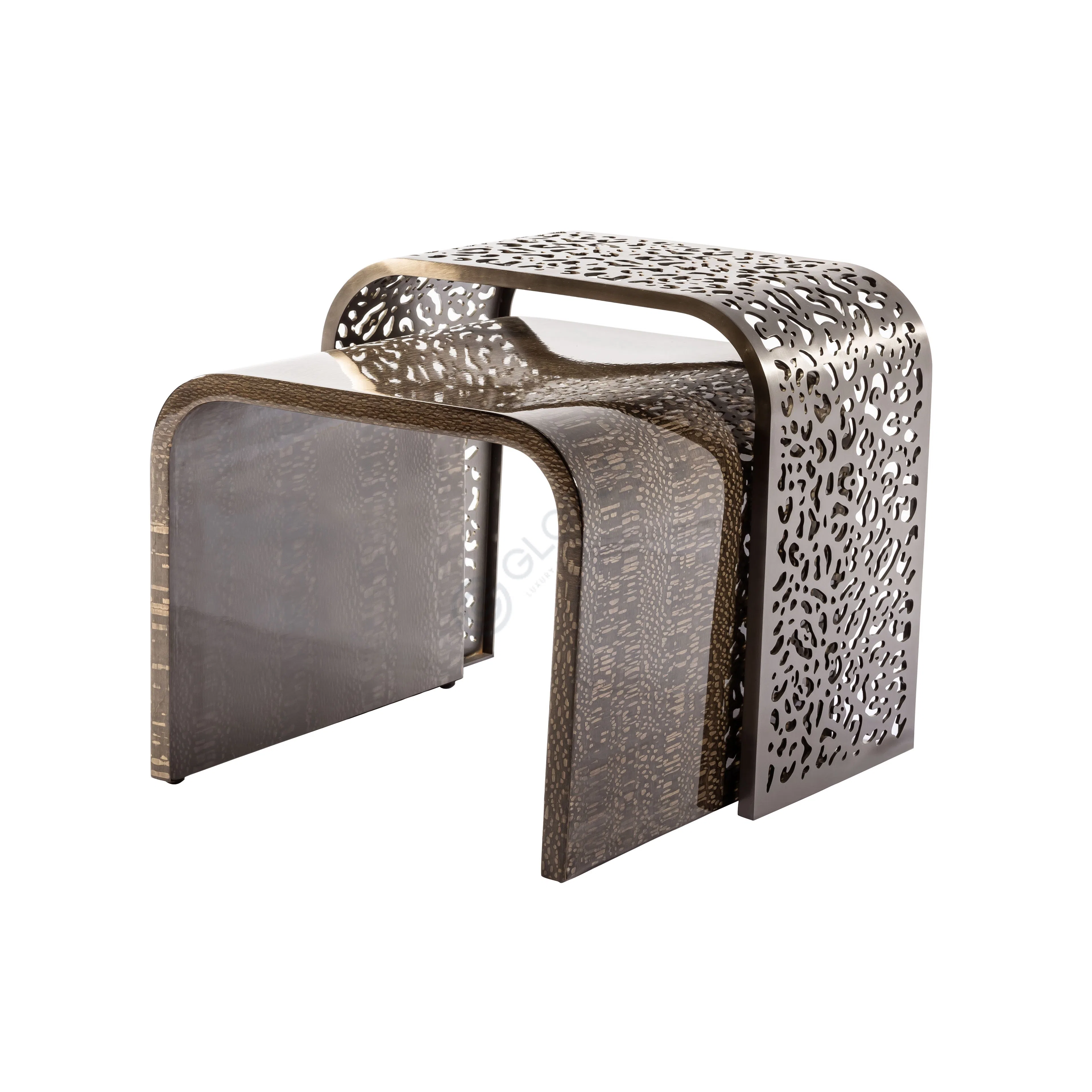 One element of the set features beautiful perforated metalwork. This intricate pattern, reminiscent of Art Deco design, adds visual interest and a sophisticated texture. The second, lower element complements it with a smooth surface, subtly finished with natural veneer over a sturdy base constructed from solid wood and plywood, embodying modern simplicity.
