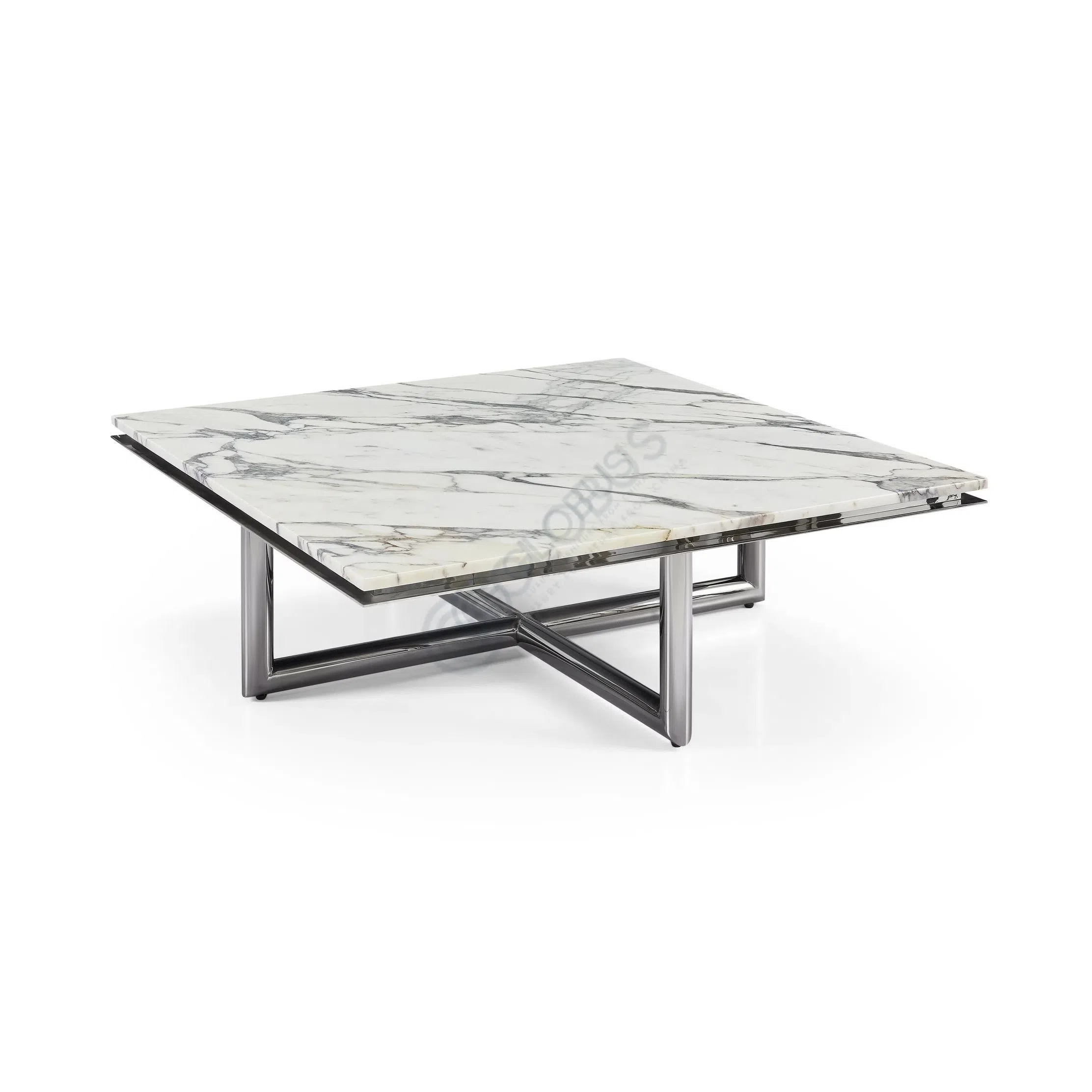The table's elegant base is constructed from stainless steel, providing robust support with a refined, contemporary design. The clean lines and polished finish of the base complement the natural beauty of the marble top, creating a harmonious blend of materials.