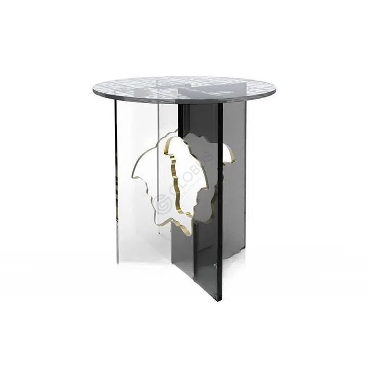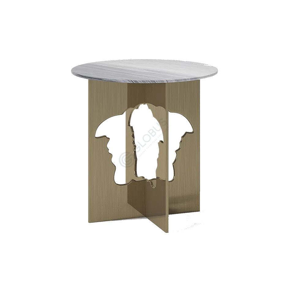 The sculptural base is formed by intersecting metal planes: one in a blackened finish, the other in a textured, warm‑gold stainless steel. A polished stainless steel connector adds subtle shine while reinforcing stability, and the cut‑out contours introduce elegant negative space.