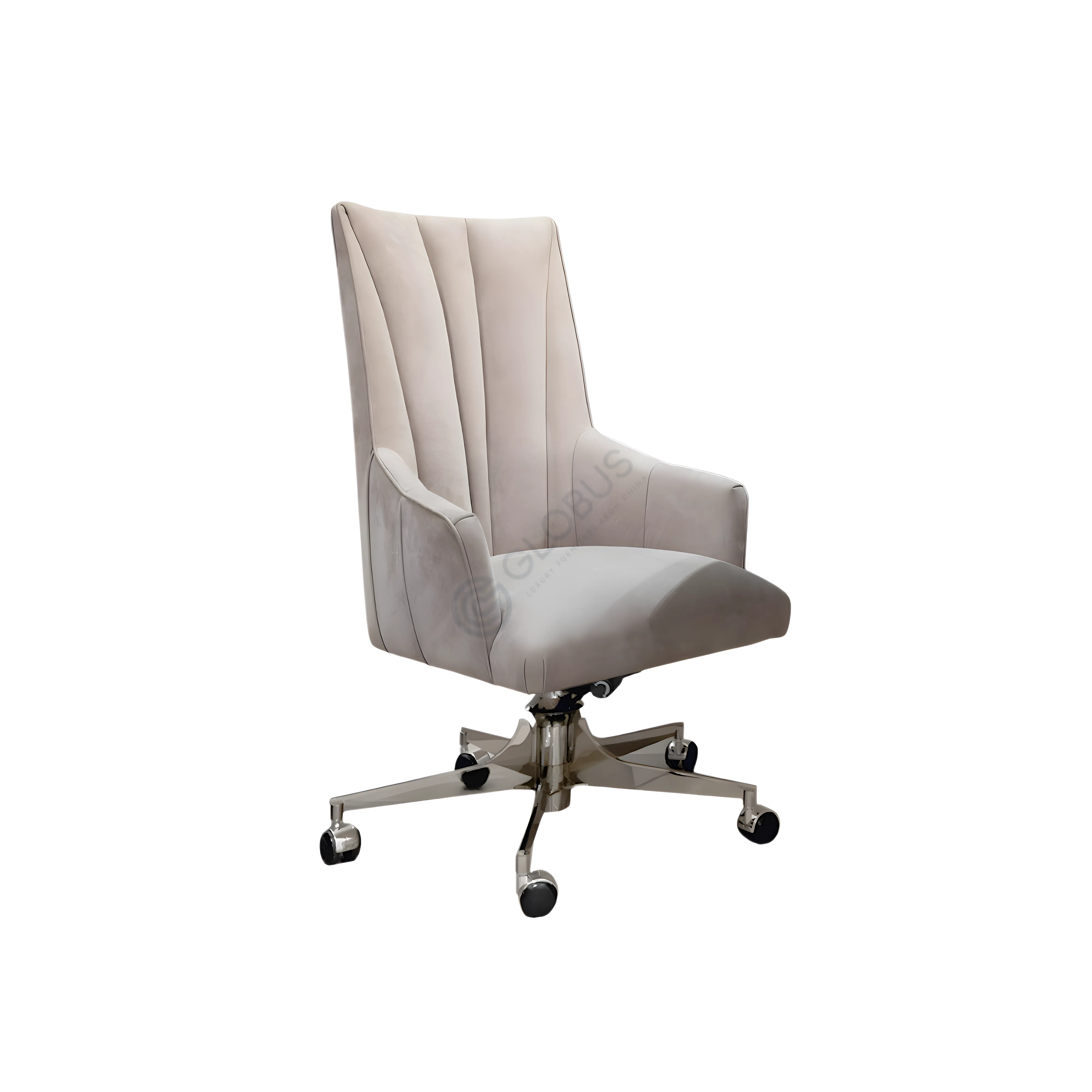 A sculpted dining chair in sand-hued suede leather, defined by a tall, fluted back and slim sheltering arms. The vertical channeling nods to Art Deco, while clean lines and tapered stainless steel legs bring a modern edge. The silhouette is refined and light, suited to both intimate kitchens and formal dining rooms.