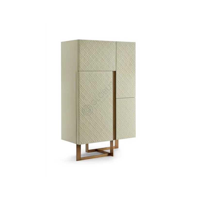 A modern cabinet defined by clean lines and a balanced asymmetry, featuring a textured microfiber leather exterior in a soft neutral tone. A slender stainless steel base in a warm metallic finish elevates the form, creating a light visual lift while ensuring sturdy support.