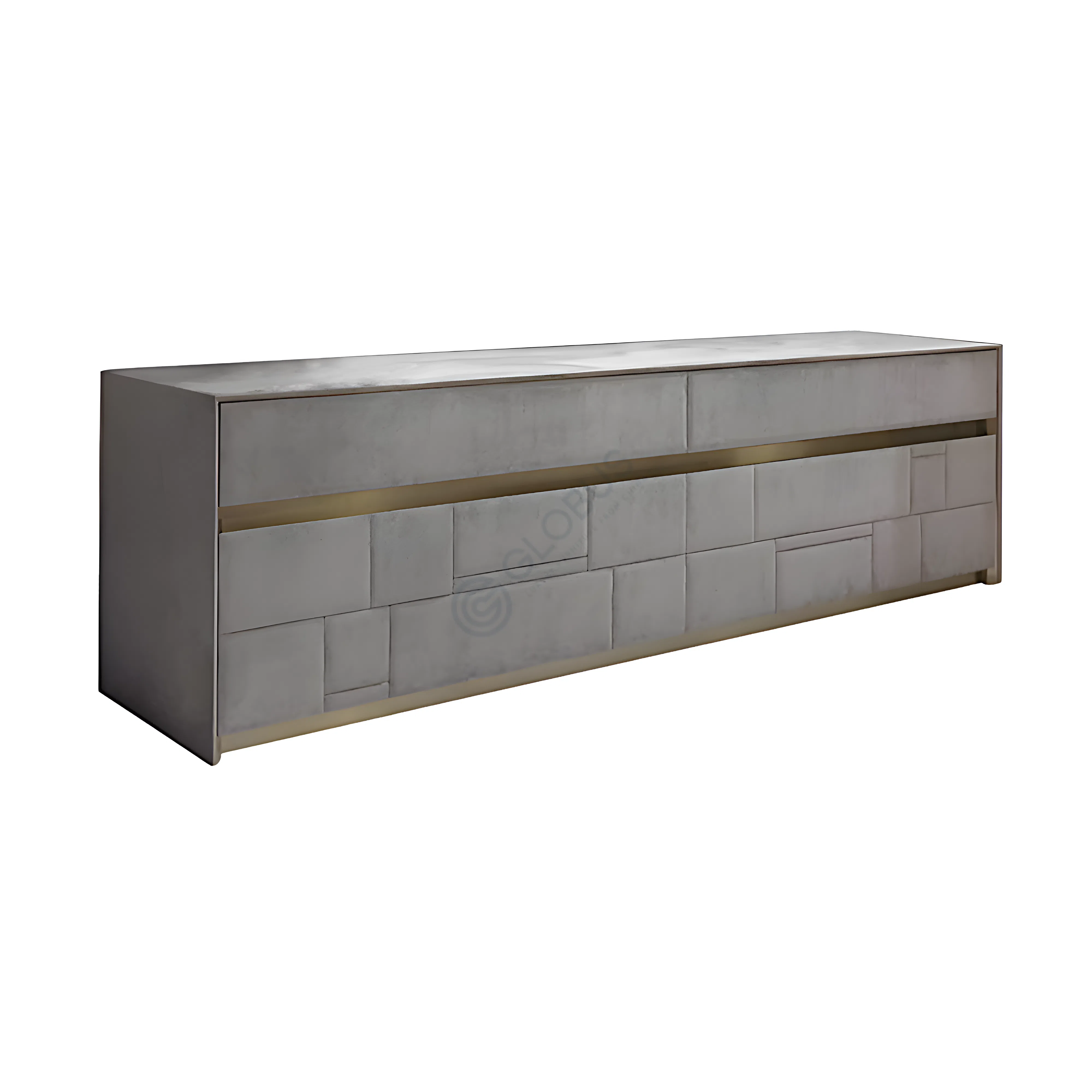 The exterior is upholstered in high-quality microfiber leather, offering a smooth and tactile surface that is both durable and easy to maintain. Underneath this refined finish, a sturdy plywood frame provides reliable structural integrity. Slim, vertical handles made of stainless steel with a warm gold finish offer a clean, minimalist touch that aligns with the contemporary aesthetic.