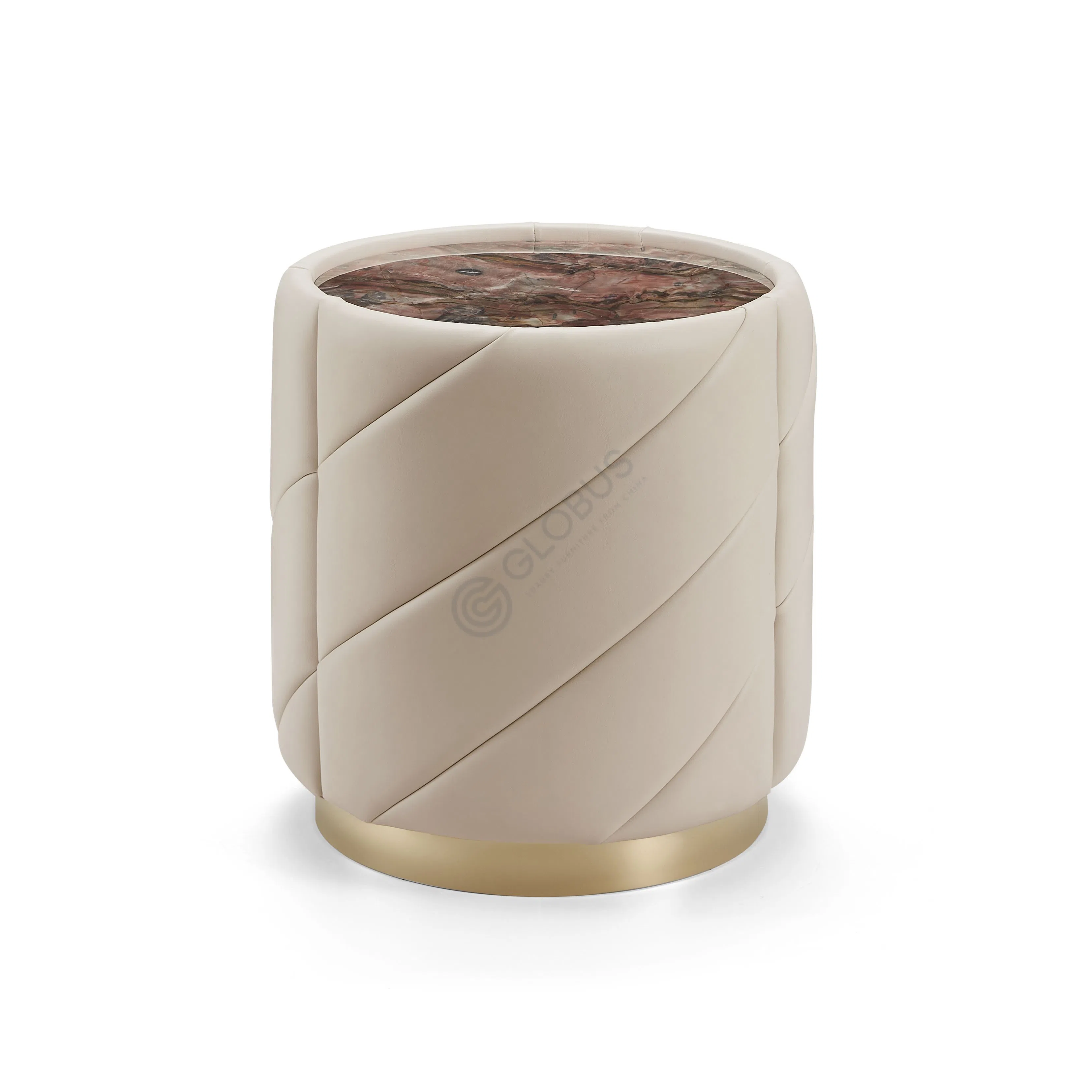 The structure is built from solid wood and plywood, ensuring durability and a quality feel. It features a surface of beautiful natural marble, offering a cool, smooth top ideal for cosmetics and accessories. The lower body is encased in elegant suede leather, detailed with subtle vertical fluting that adds a touch of texture and visual interest. The base, made from polished stainless steel, provides stable support and a refined metallic accent.