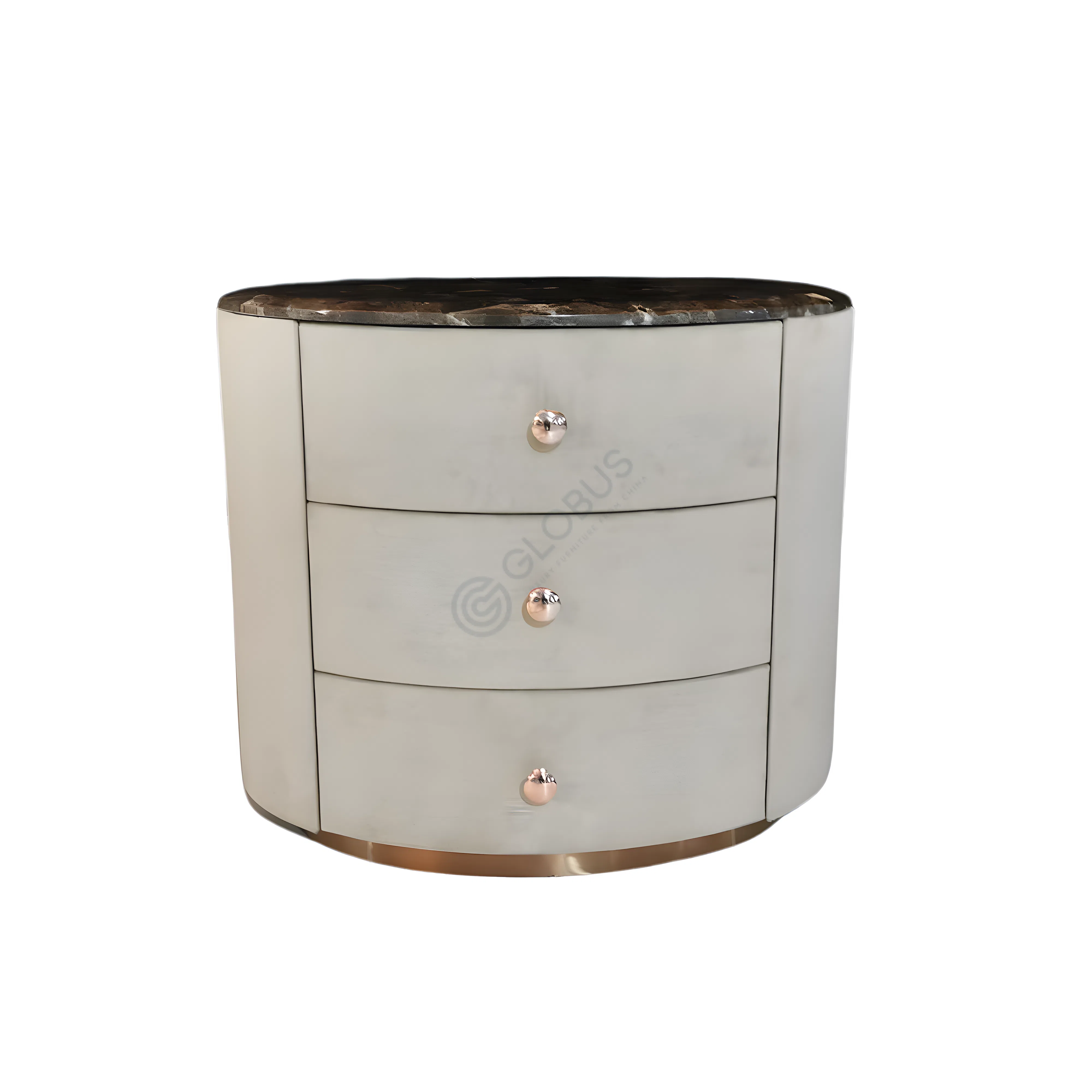 Equipped with three spacious drawers, this dresser offers ample storage, combining functionality with its distinctive aesthetic. It is a versatile piece, designed to enrich a modern interior with its comfortable textures and clean lines.